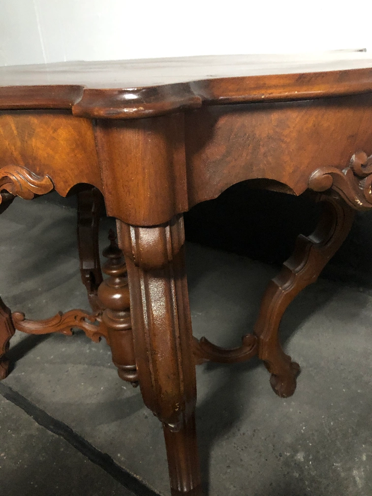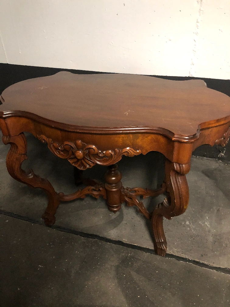 Selling a lovely vintage wood parlour table. It has a unique shape and beautiful carved details.