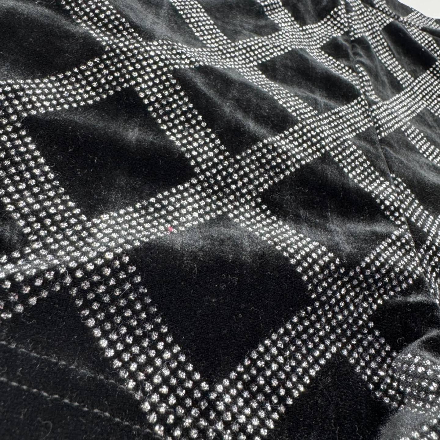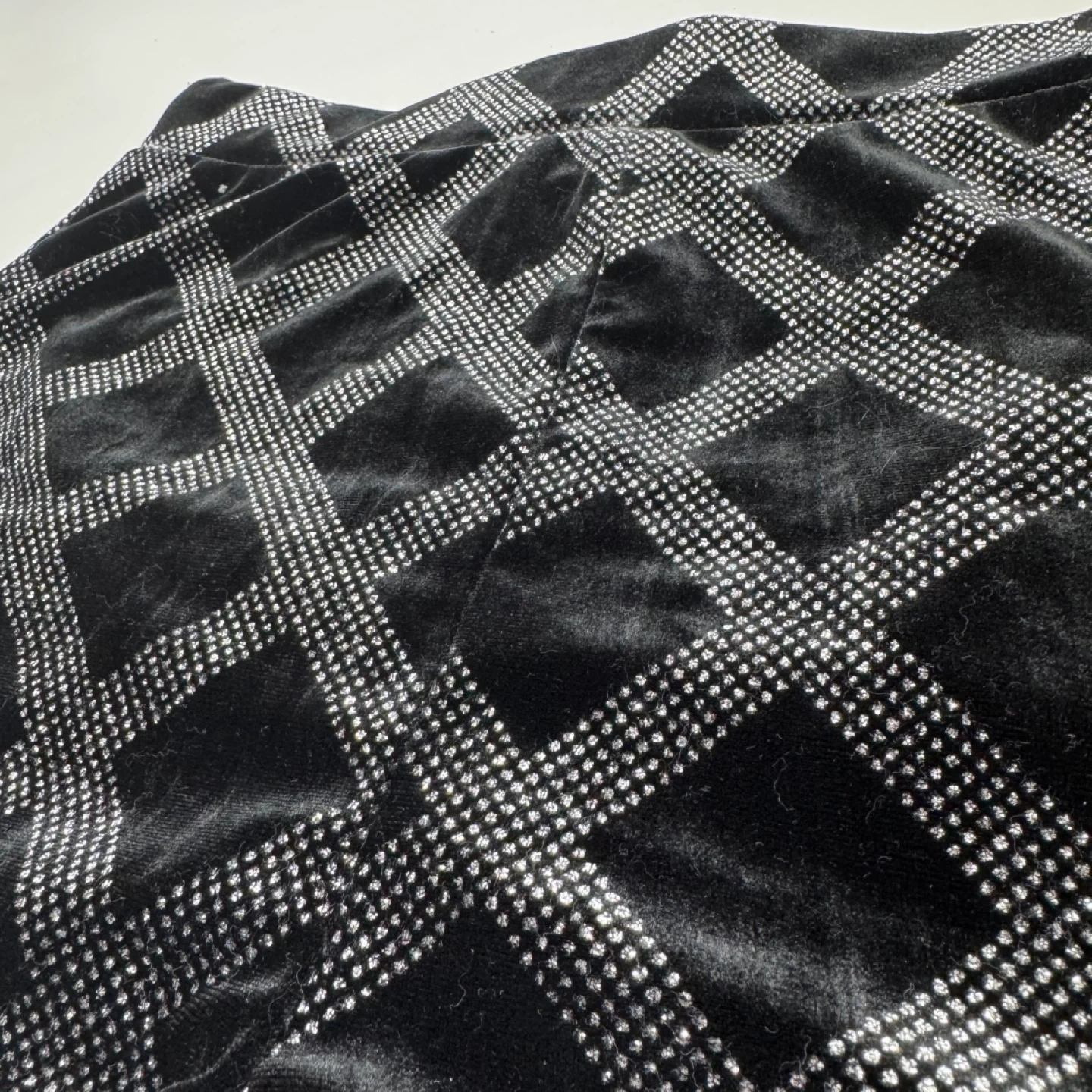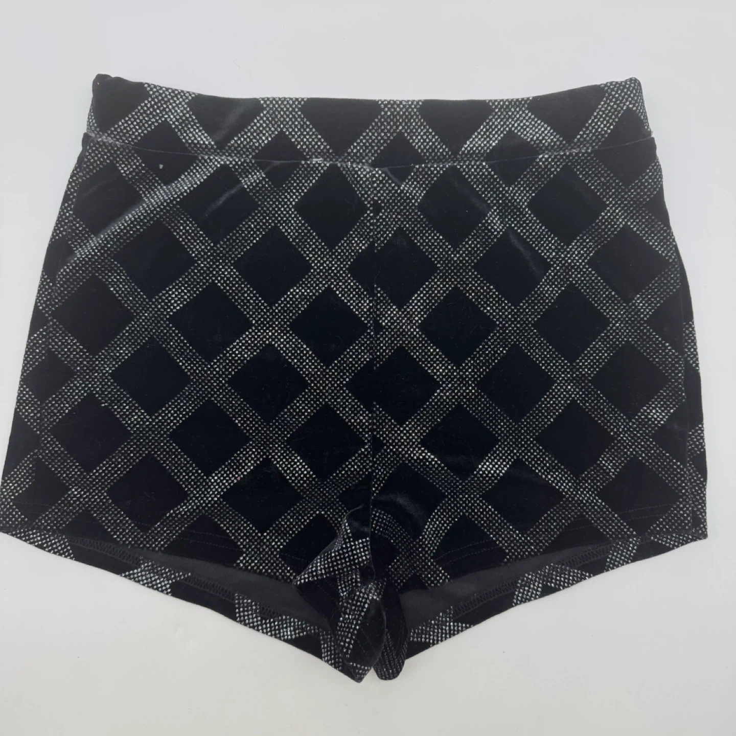 Stylish Shein women's shorts featuring a luxurious black velvet fabric with a shiny checkered pattern. Perfect for parties or nights out, these shorts offer a chic and comfortable fit.