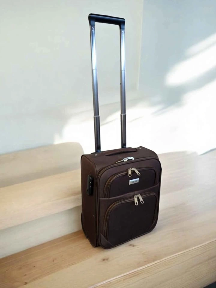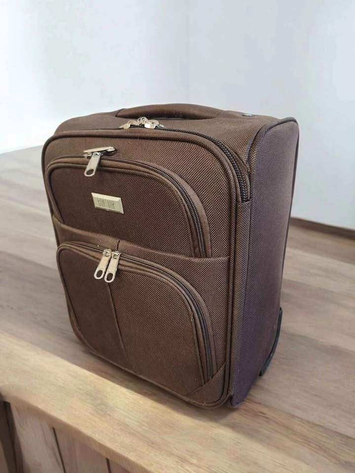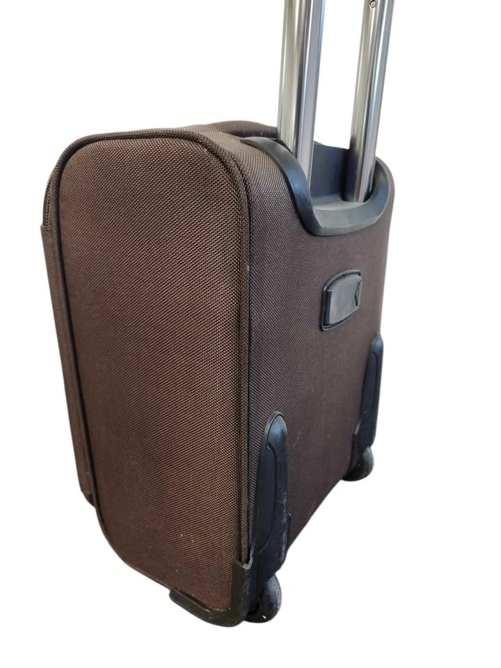 Brown, soft-sided carry-on suitcase, brand Boujour. Small, wheeled suitcase, which could potentially be used as a carry-on or underseat bag on airlines like Wizz Air. These suitcases are known for being lightweight, durable, and featuring spinner wheels. "Small luggage 214/S". It features a semi-rigid fabric construction (likely polyester or nylon), an expandable design, and a telescopic handle system.