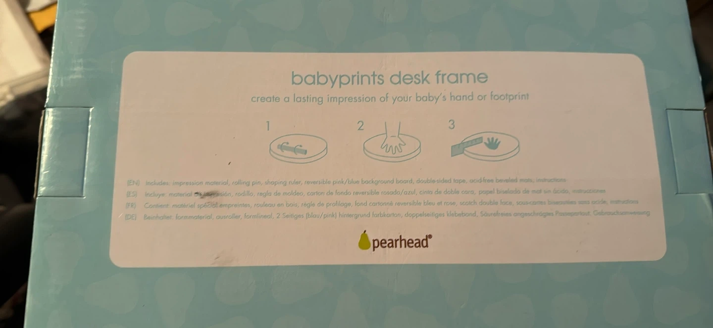 100Keep a lasting impression of your baby's hand or footprint with this Pearhead babyprints desk frame! Includes impression material, rolling pin, shaping ruler, reversible pink/blue background board, double-sided tape, and acid-free beveled mats, plus instructions