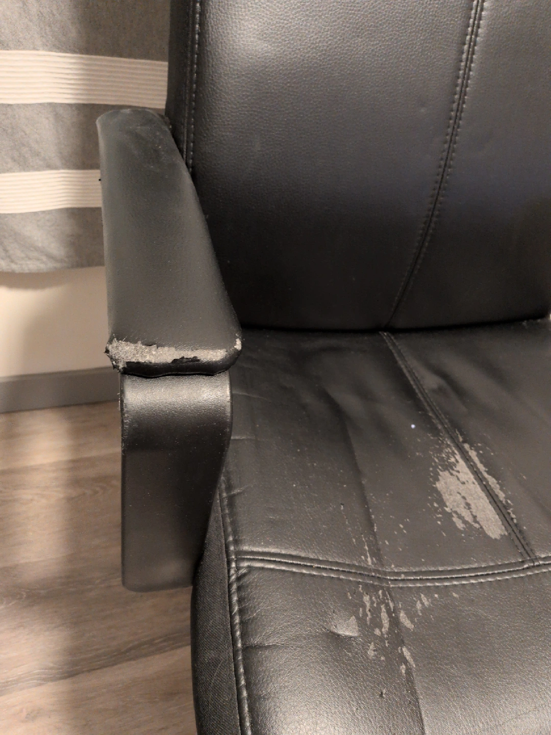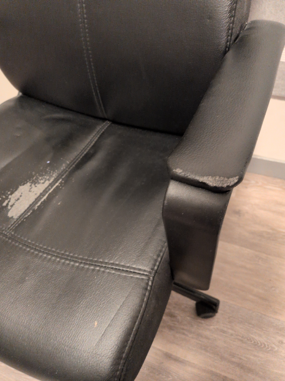 Selling a black office chair. It has some visible wear and tear on the seat and armrests, as shown in the photos. Still functions well! Still swivels and goes up and down.