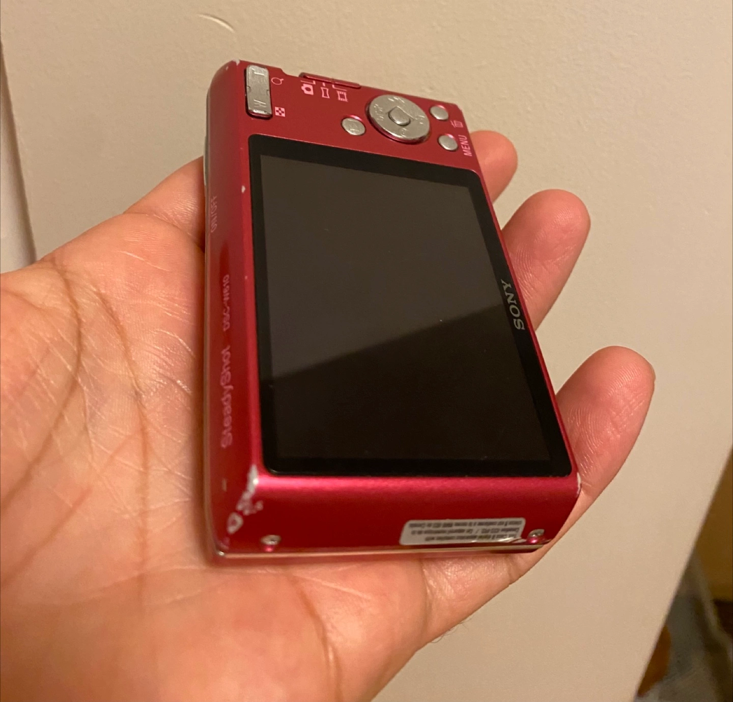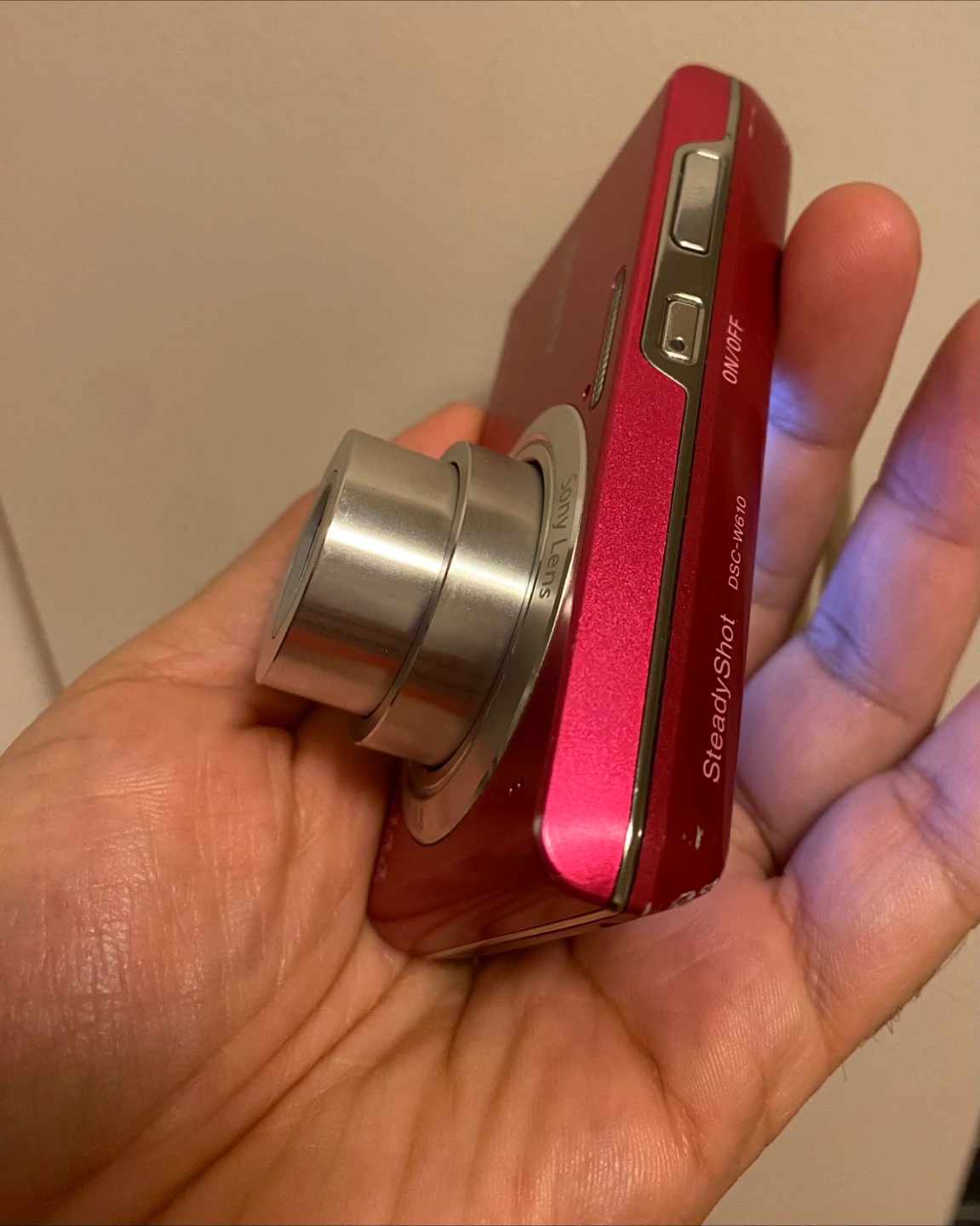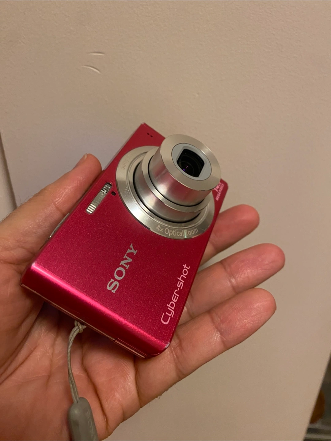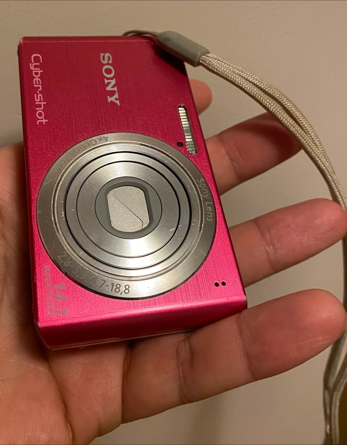 Selling a pink Sony Cyber-shot DSC-W610 digital camera. It shows some signs of wear, but it's still functional! The camera features a Sony lens and 4x optical zoom. It's a great little camera for capturing memories!