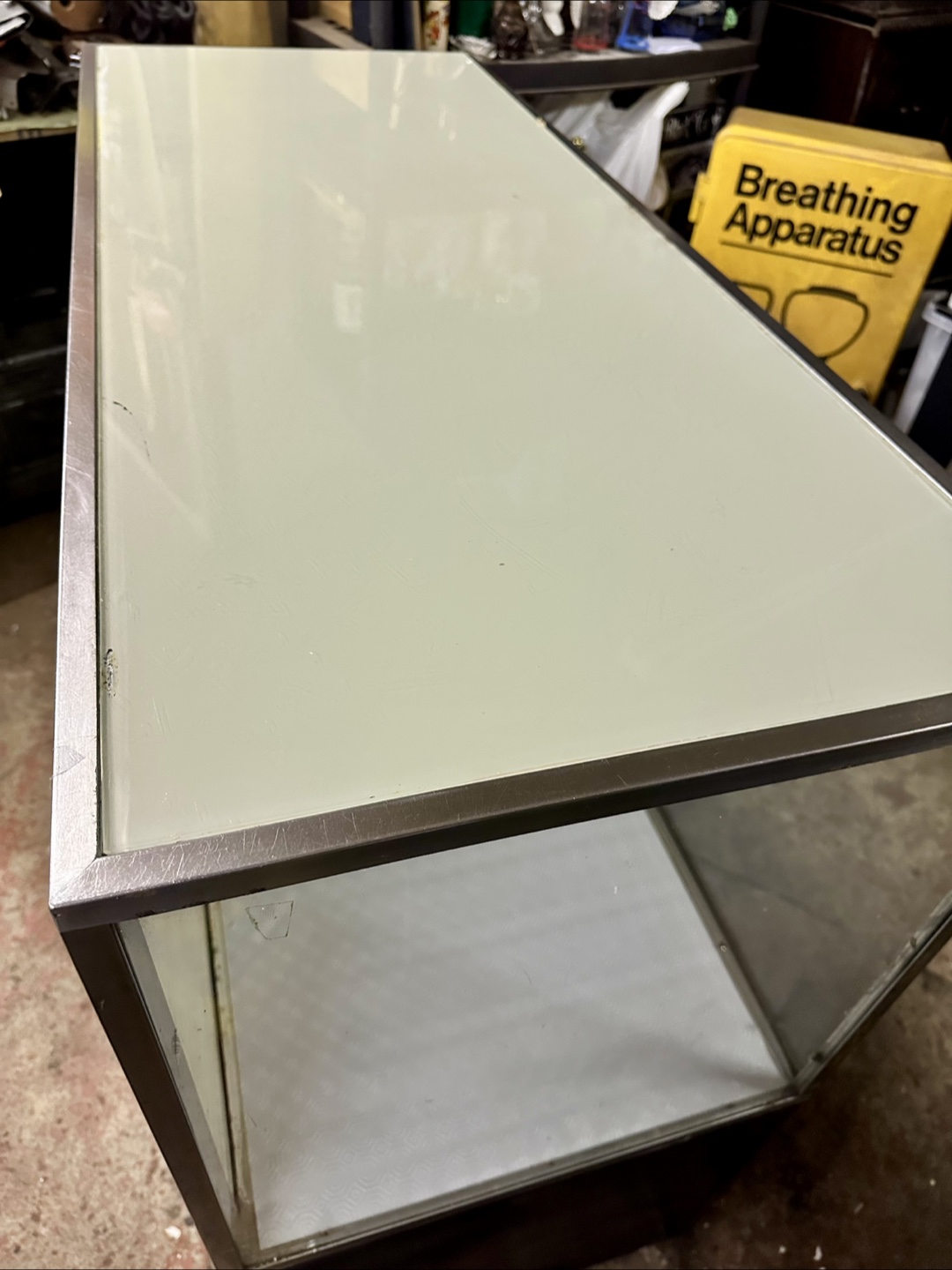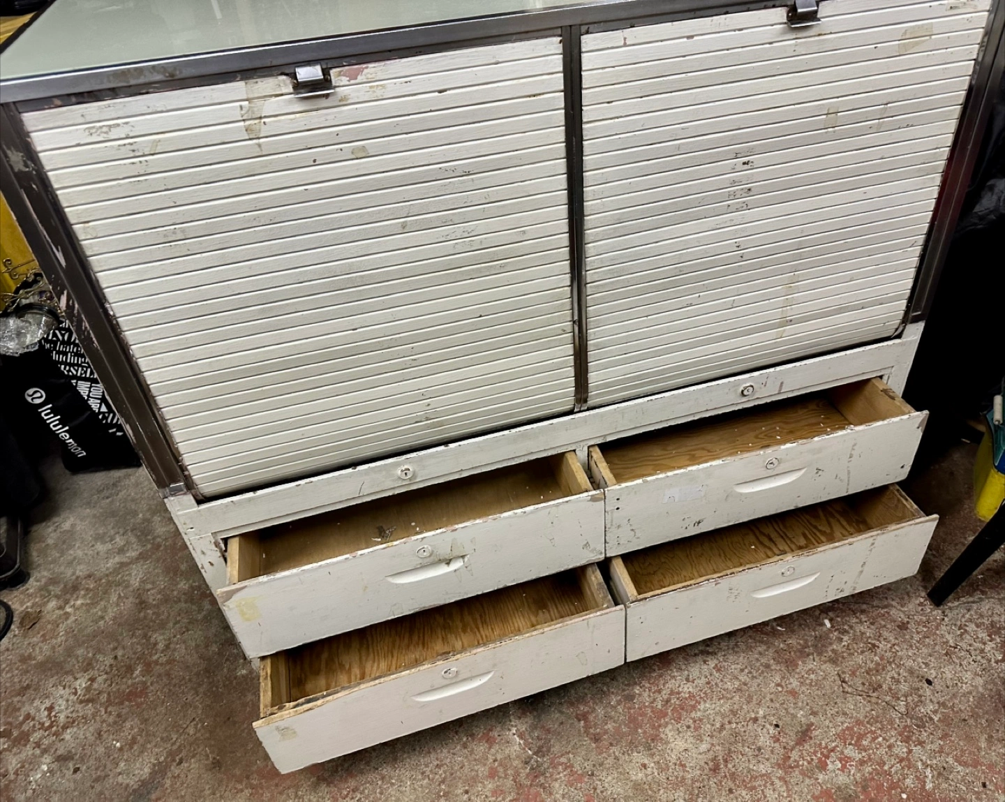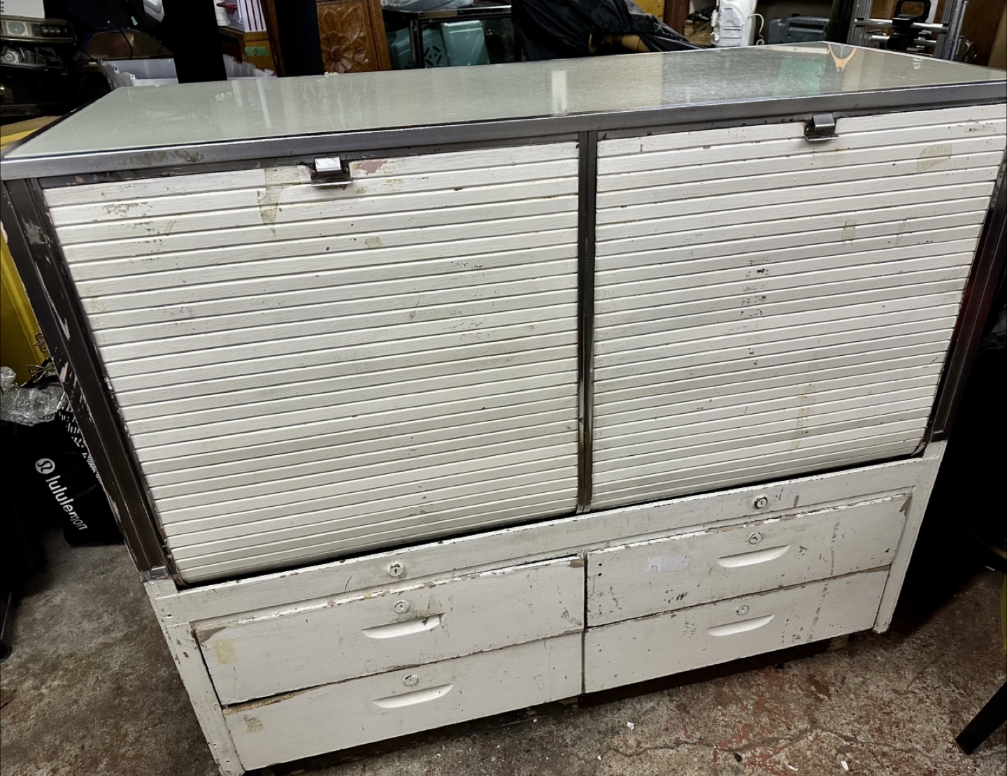 Selling a vintage display cabinet, perfect for showcasing items or adding a unique touch to your space. It features a glass top and front, along with a base that has both roll-up doors and drawers for storage. It's in used condition, showing some signs of wear, but it's still a functional and eye-catching piece!