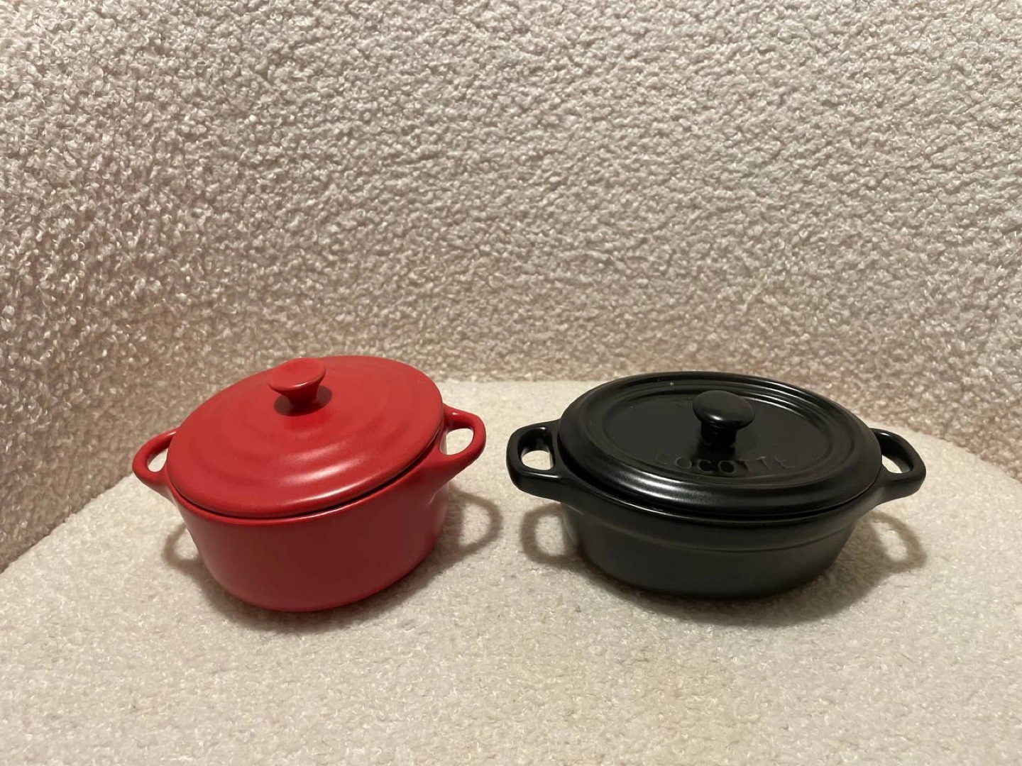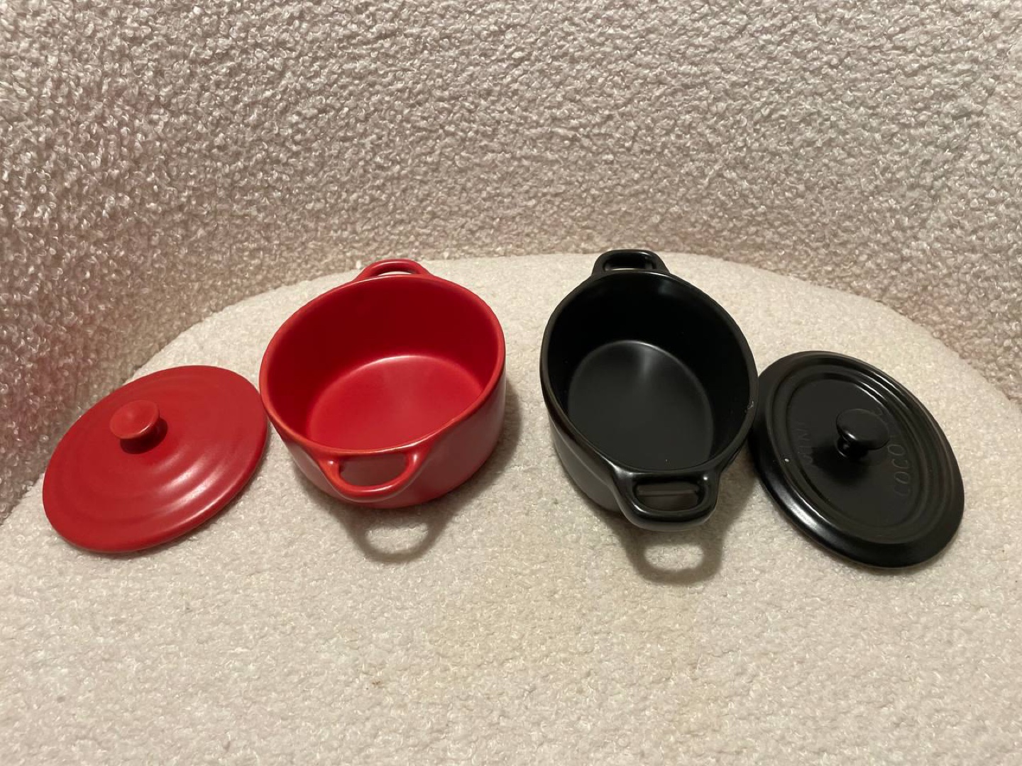 Selling two mini casserole dishes, one in red and one in black. They're perfect for individual servings or dips. These cute little cocottes are in great condition and ready for a new home!