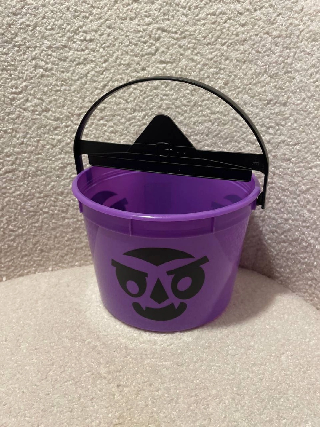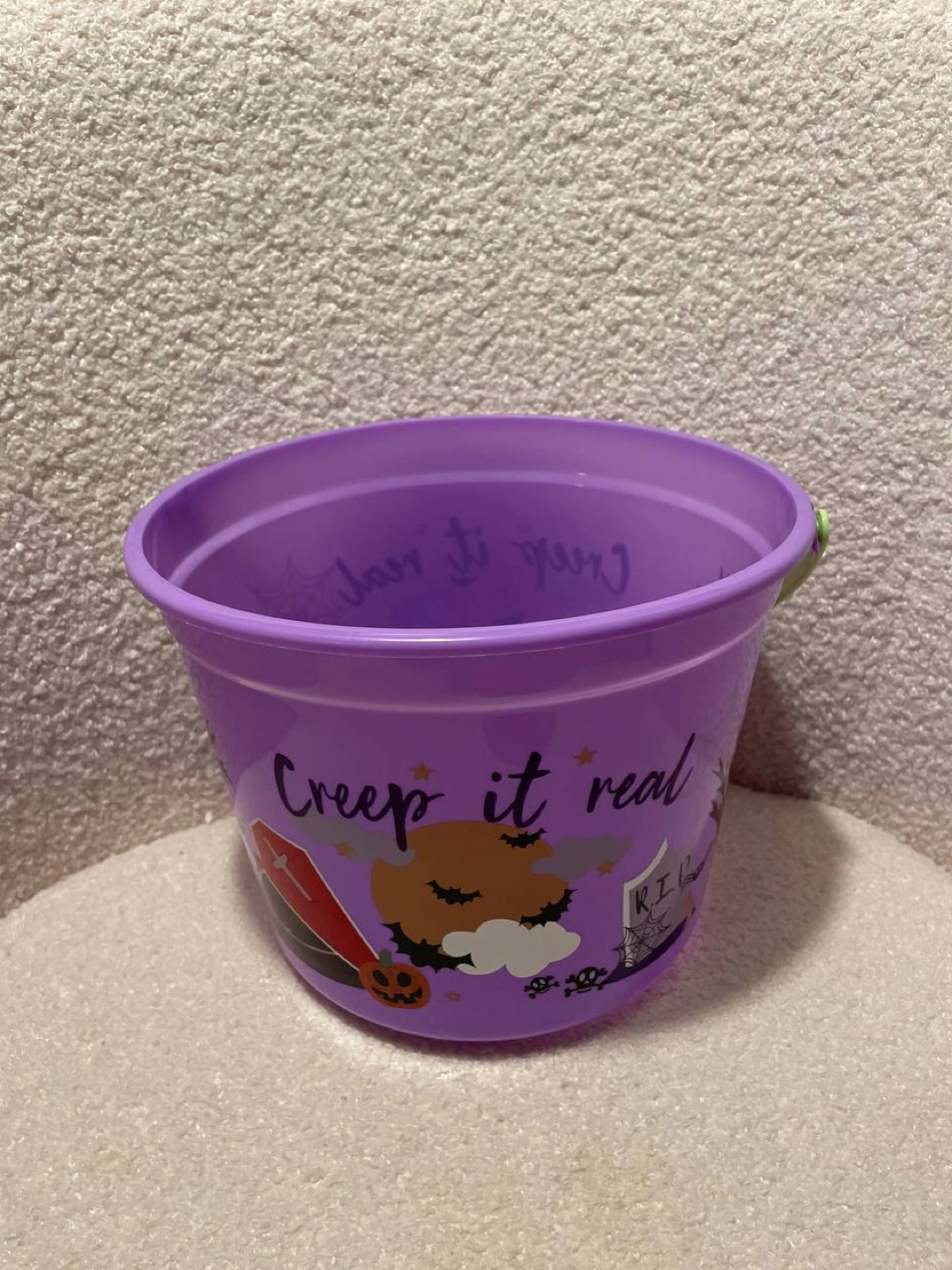 Selling a cute purple Halloween bucket! It has a fun "Creep it real" design on one side and a spooky face on the other. Perfect for trick-or-treating or Halloween decorations!