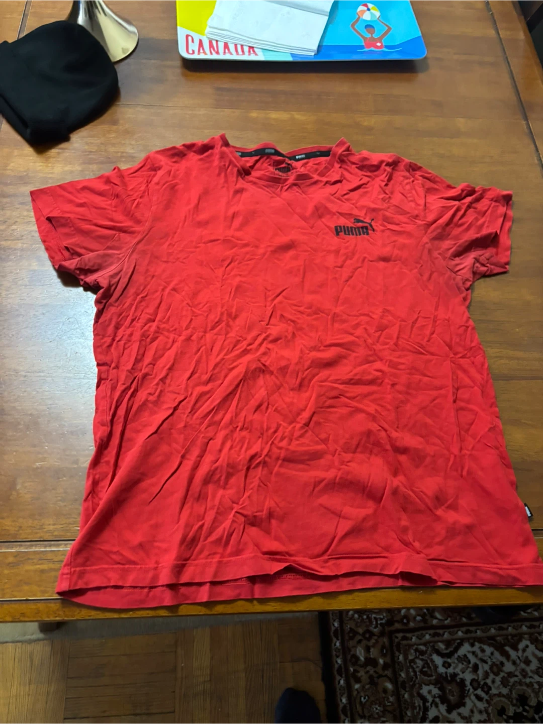 Selling a red Puma t-shirt in size large. It's in good condition and ready for a new home! The Puma logo is on the front.