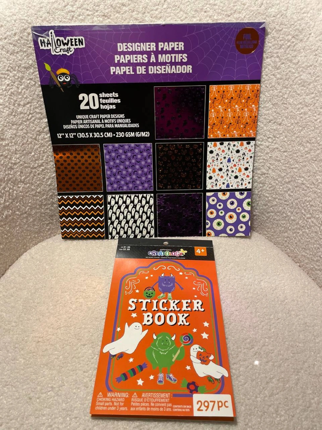Selling a Halloween Craft designer paper pack with 20 sheets of unique craft paper designs. The paper size is 12" x 12" (30.5 x 30.5 cm) and 230 GSM (G/M2). Also included is a Creatology sticker book with 297 pieces, suitable for ages 4+