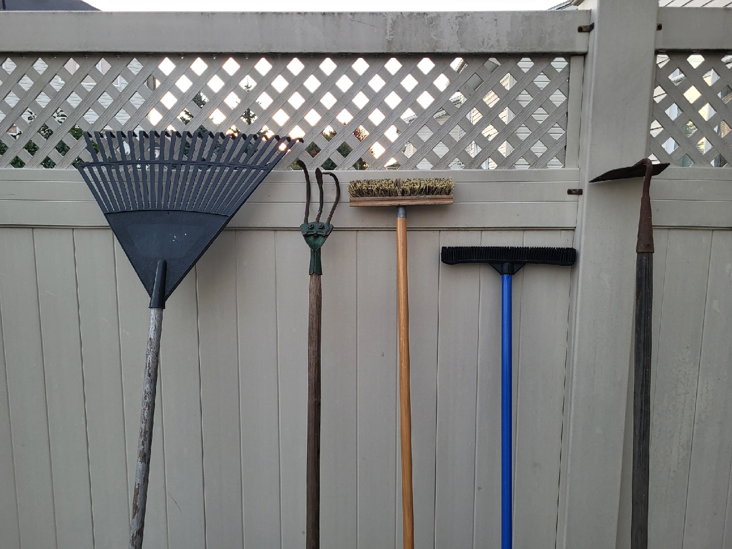 Selling a set of used garden tools. Includes a leaf rake, garden hoe, push broom, and a smaller broom. All are in used condition and ready for your garden projects! They price is for each.