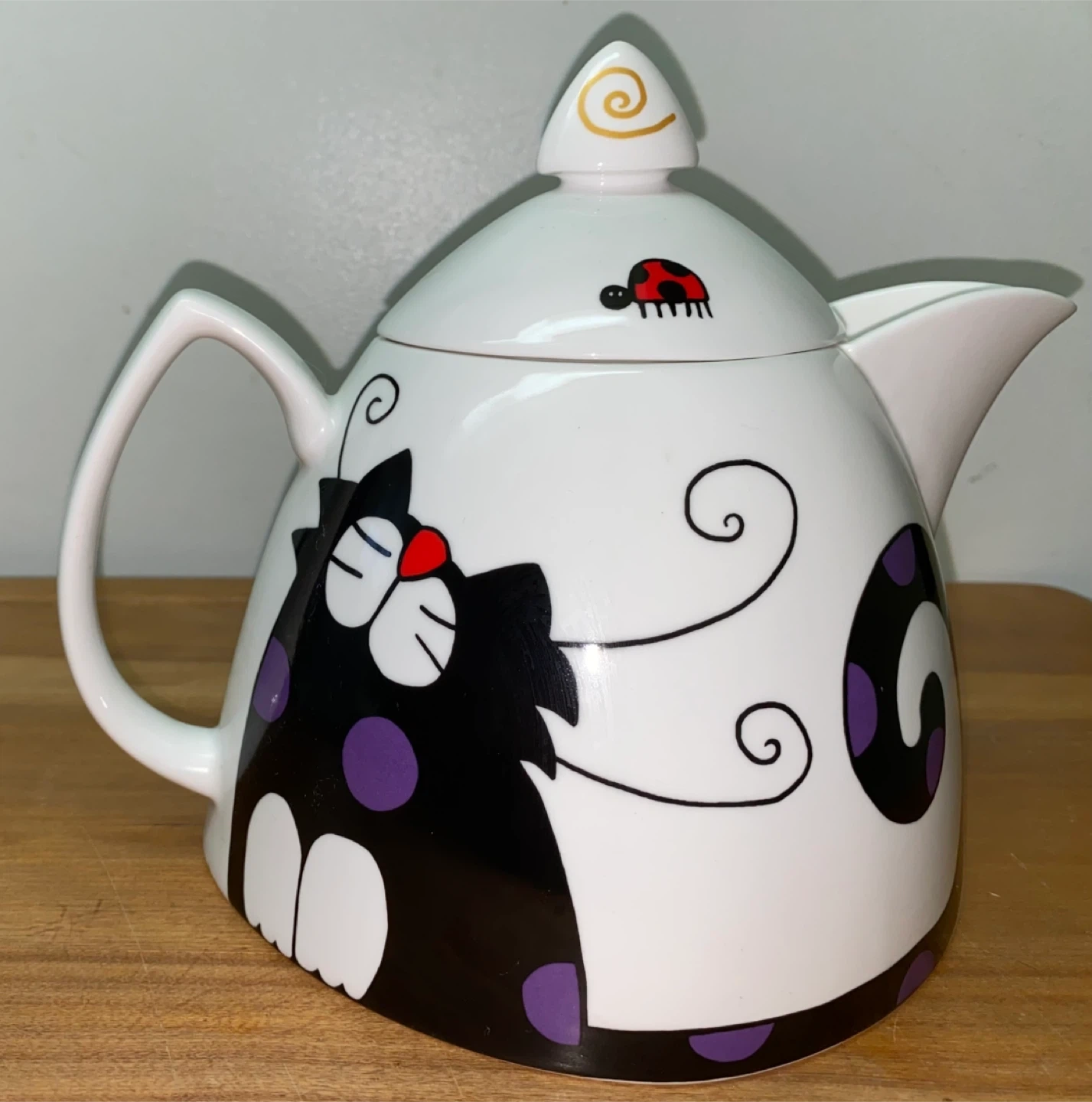This is a charming white ceramic teapot featuring a playful cat design with purple polka dots and a cute ladybug detail on the lid. It's in great condition and would be a lovely addition to any tea lover's collection or a whimsical touch to your kitchen decor. Perfect for brewing your favourite tea and enjoying a cozy afternoon.