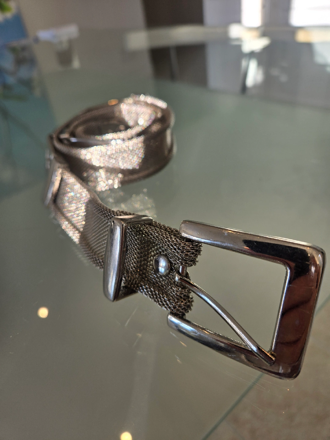 Selling a stylish Guess belt! It features a unique silver mesh design. This belt is perfect for adding a touch of elegance to any outfit. It's in great condition and ready for a new home