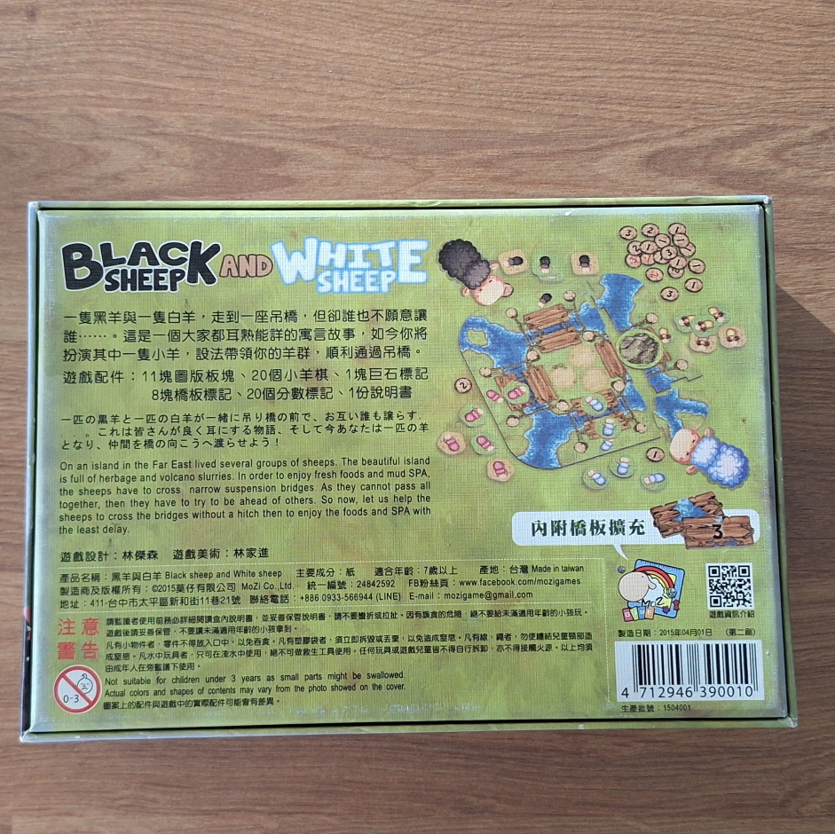 Free pickup: Black Sheep and White Sheep board game! It's a fun game for 2-4 players, and suitable for ages 5+. The game includes 1 game board, 20 sheep pieces, 1 giant rock, 8 suspension bridges, and an instruction manual in English.