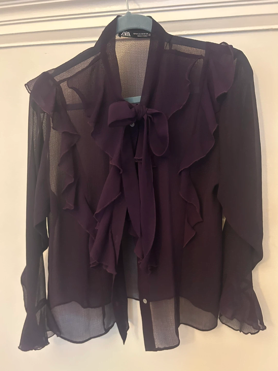 A beautiful, sheer Zara blouse in a deep purple hue! Delicate ruffles around the collar and down the front. Can be tied in bow or left open. It's a size medium. Perfect for adding a touch of elegance to any outfit! Can pick up downtown or High Park area