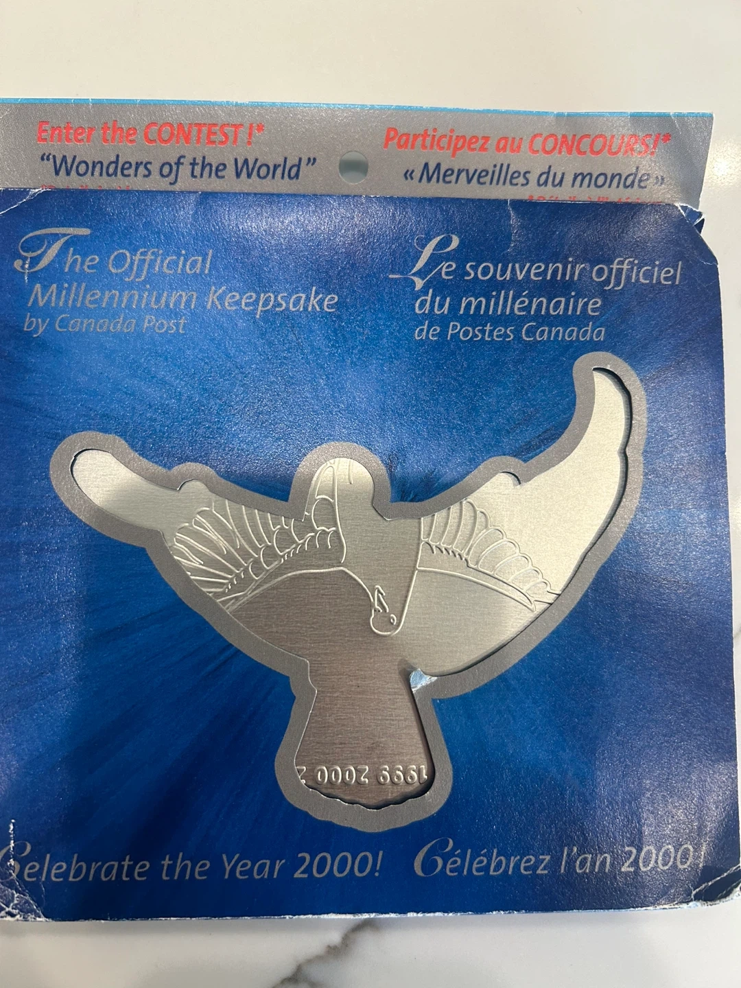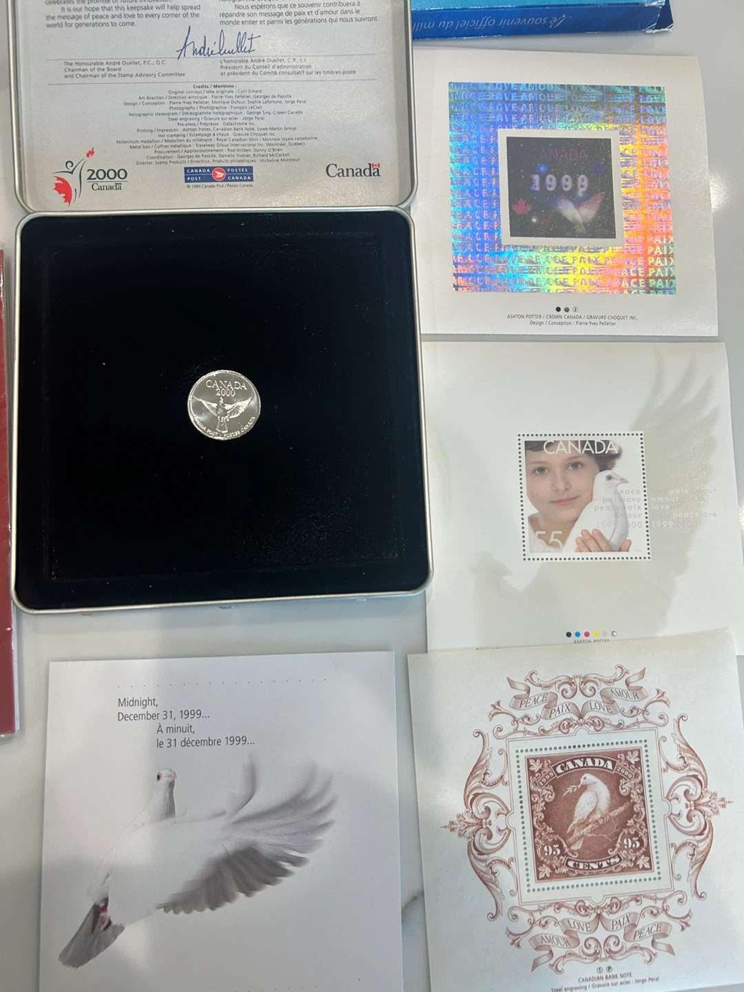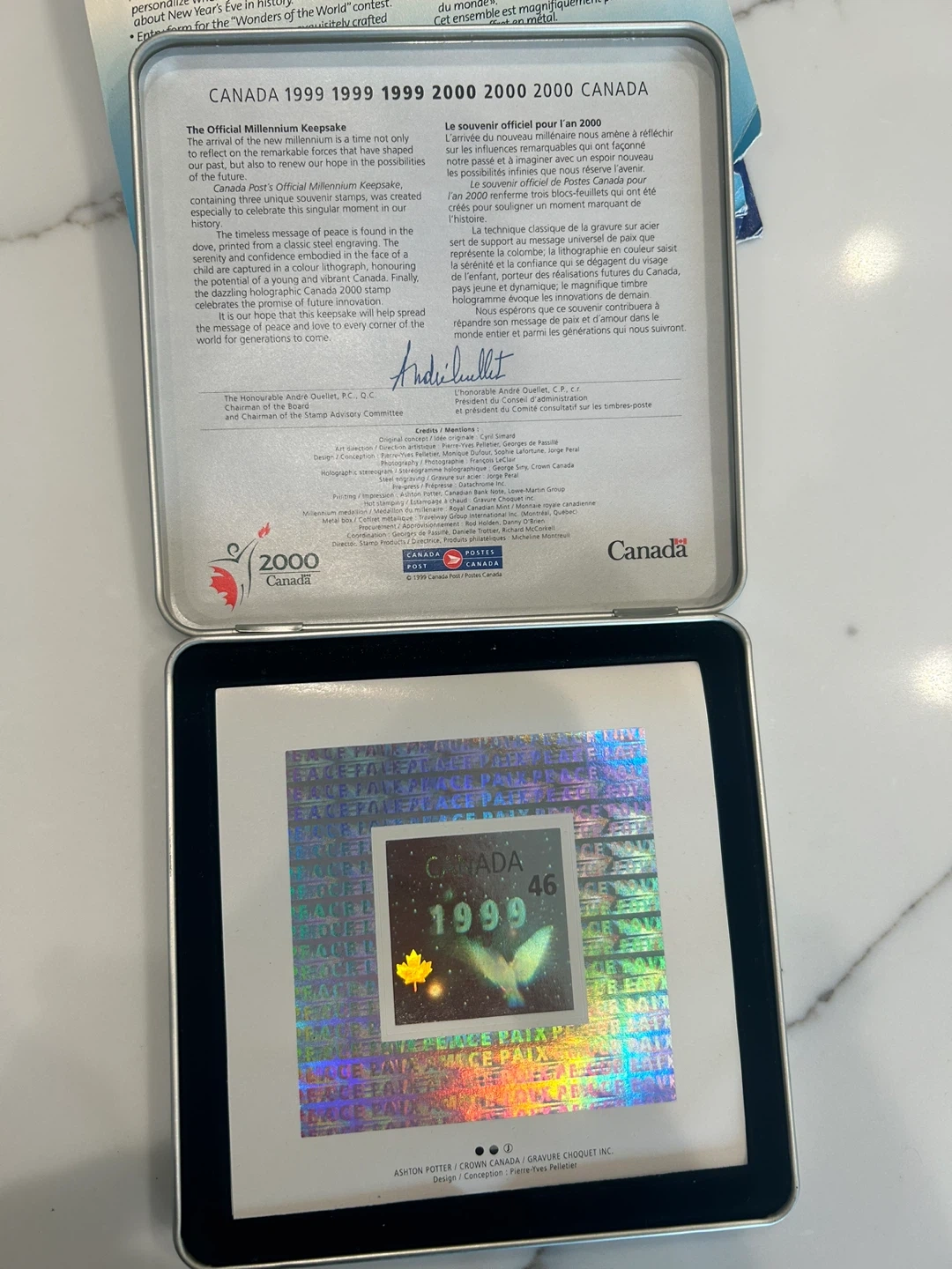 1000+Selling a Canada Post Millennium Keepsake set from 1999-2000. This official Millennium Keepsake has both an inspiration and a memento of a pivotal moment in world history. It includes a commemorative medallion struck by the Canadian Mint, featuring the dove and Canada's maple leaf and a set of three stamps. It's presented in an exquisitely crafted metal box