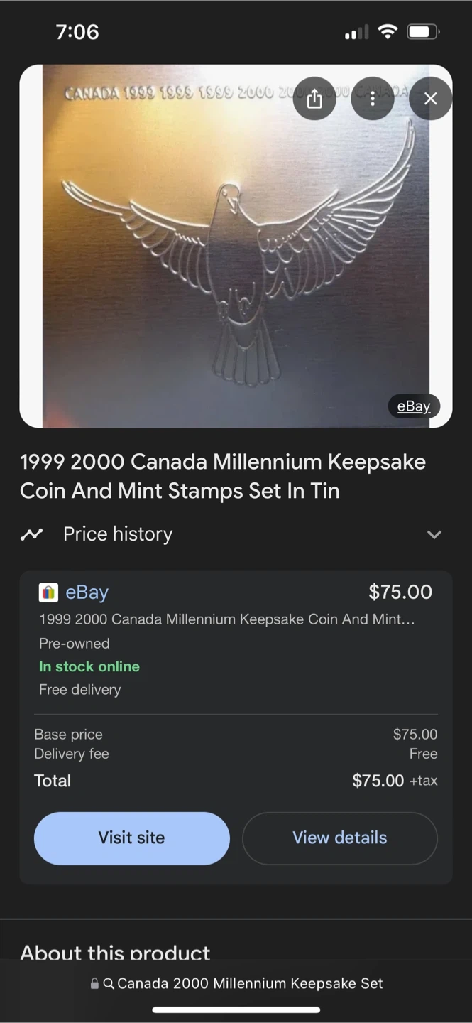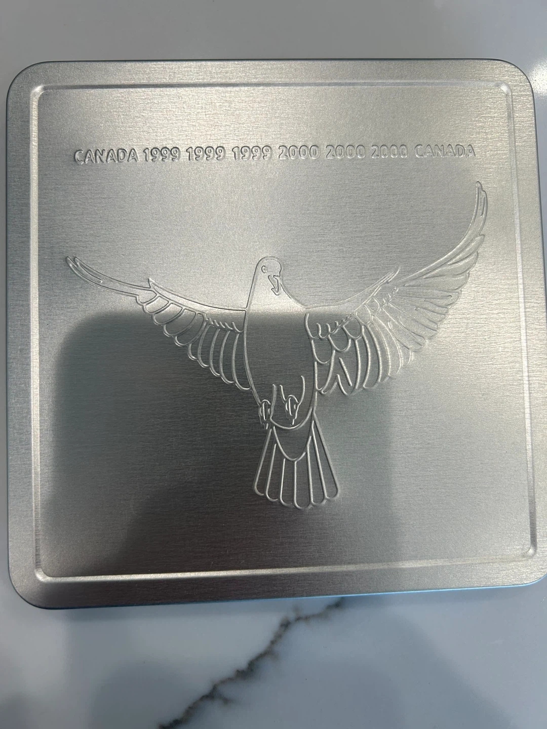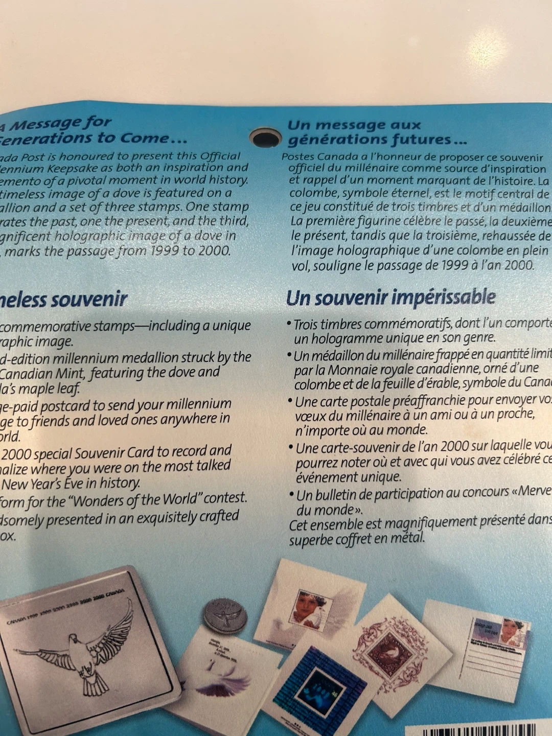 1000+Selling a Canada Post Millennium Keepsake set from 1999-2000. This official Millennium Keepsake has both an inspiration and a memento of a pivotal moment in world history. It includes a commemorative medallion struck by the Canadian Mint, featuring the dove and Canada's maple leaf and a set of three stamps. It's presented in an exquisitely crafted metal box