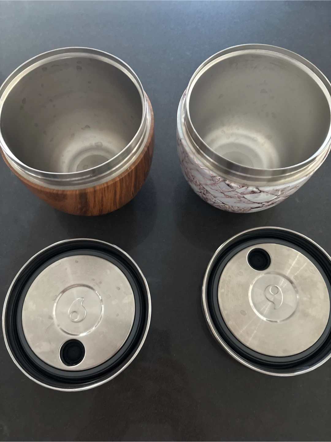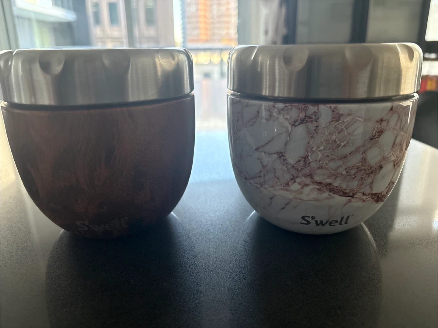 210Selling a set of two S'well Eats food containers. One is a wood grain design and the other is marble. Each container holds 21.5oz / 636 ml. Hand wash recommended! Used wood grain one only a few times. Only ever with plastic bowl inserts (not included)