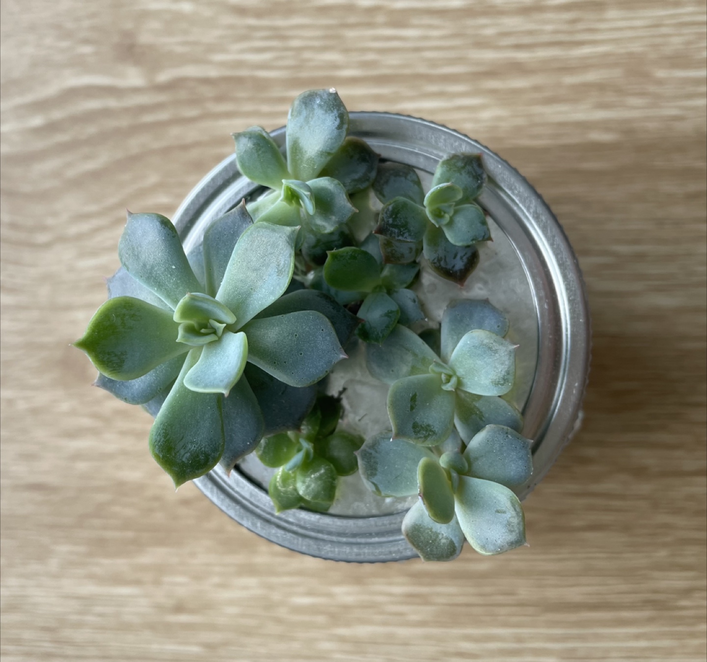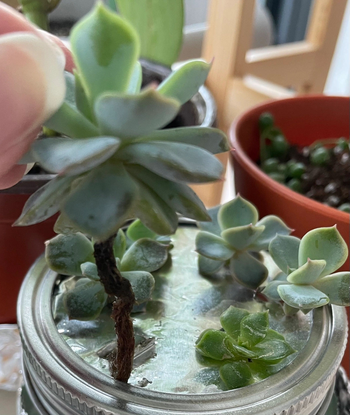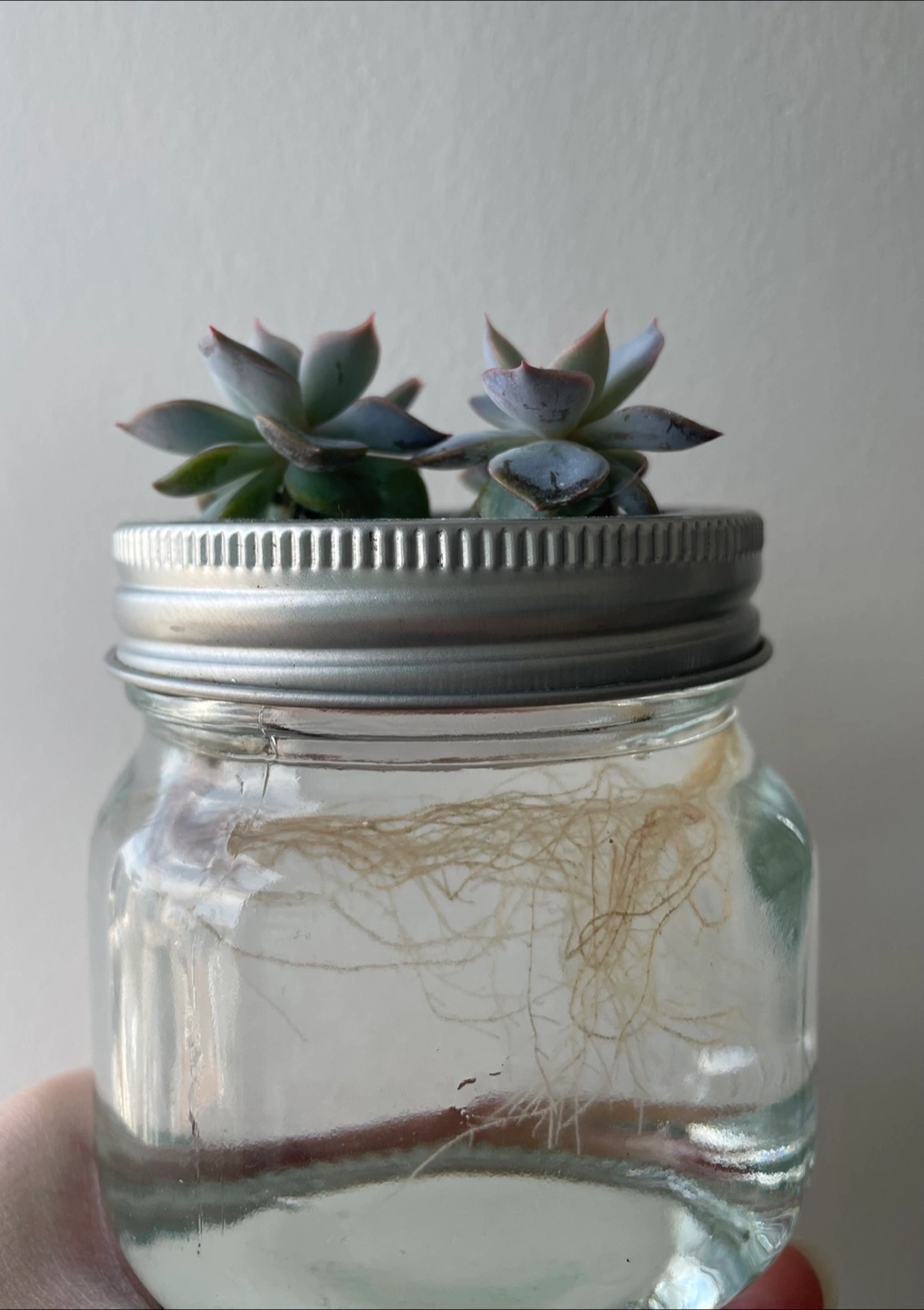 Rooted Echeveria in water. These succulents can grow in water without soil. They look pretty in a jar and can make great gifts.