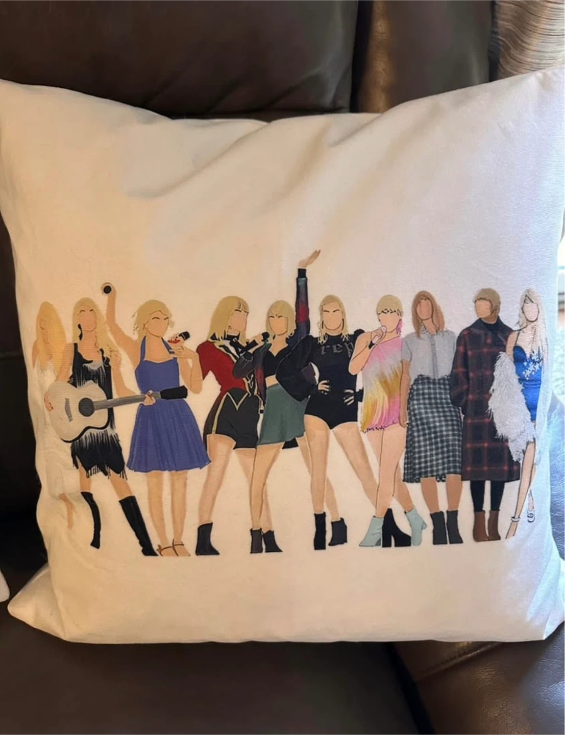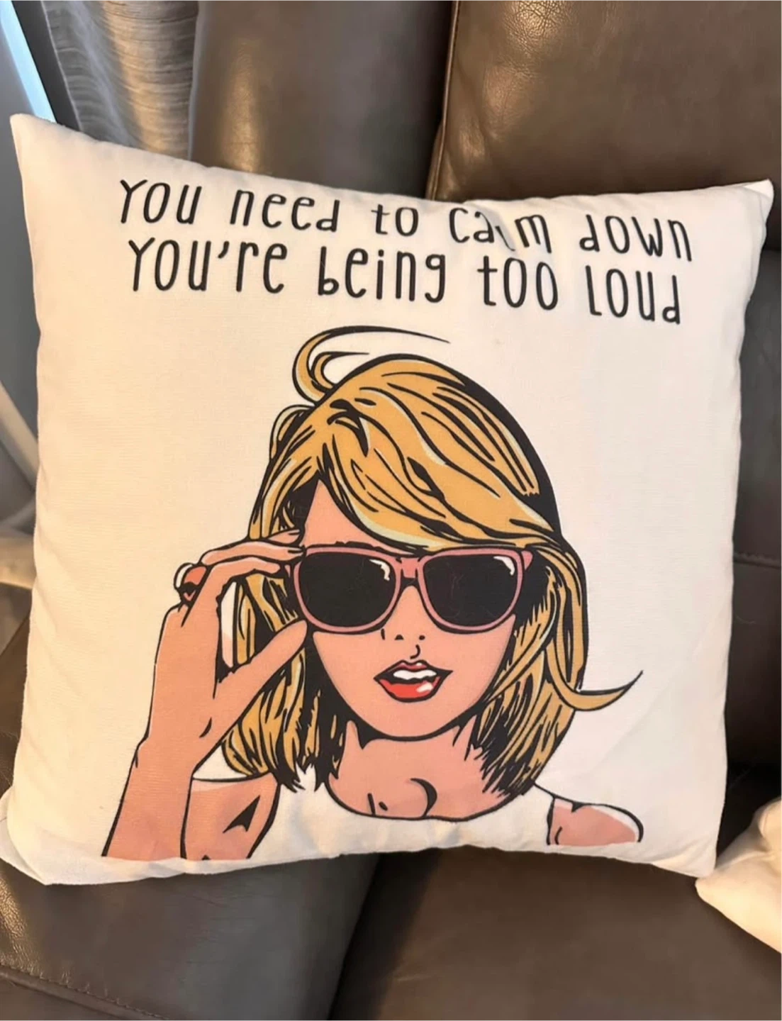 Selling a set of two decorative pillows featuring Taylor Swift designs! One pillow has a cartoon image of Taylor with the words "You need to calm down you're being too loud". The other pillow has a cartoon image of Taylor with other people. They're in great shape and would be perfect for any Swiftie's room 20x20
