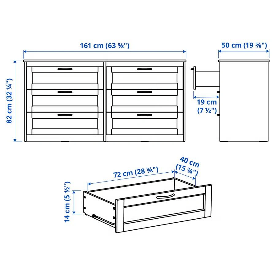 10The drawers on this chest of drawers extend 19 cm, which helps reduce the risk of tipping when anchored to the wall. Smooth running drawers with pull-out stop. A wall-anchoring kit is included. Depth: 50 cm (19 5/8 ") Drawer depth (inside): 40 cm (15 3/4 ") Height: 82 cm (32 1/4 ") Width: 161 cm (63 3/8 ") Drawer width (inside): 72 cm (28 3/8 ") Storage capacity: 241 l (8.5 cu.ft) Drawer pull-out: 19 cm (7 1/2 ") Let me know if you're interested!