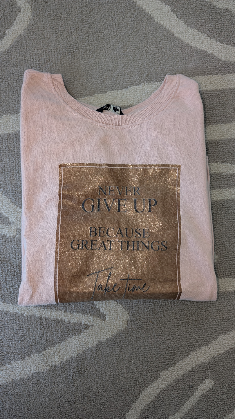 Selling a cute pink sweatshirt with a graphic design that says 'Never Give Up Because Great Things Take Time' It's in great condition and ready for a new home!