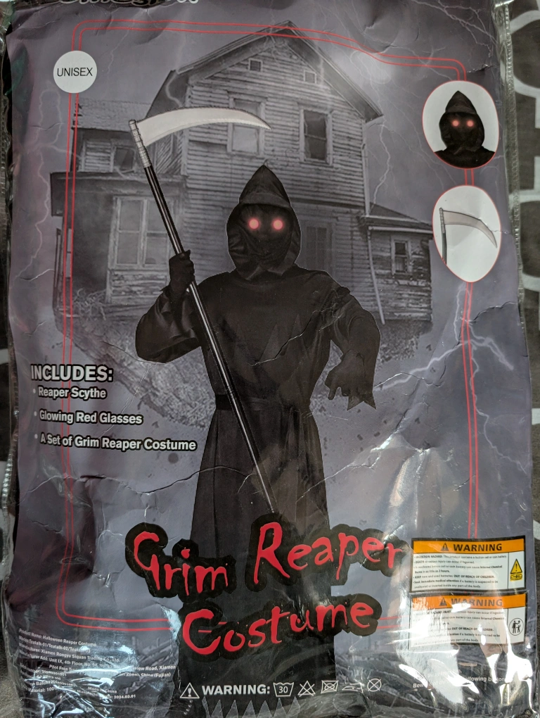 Includes: Glowing Red glasses, Reaper Scythe/Axe, full Grim Reaper Costume.