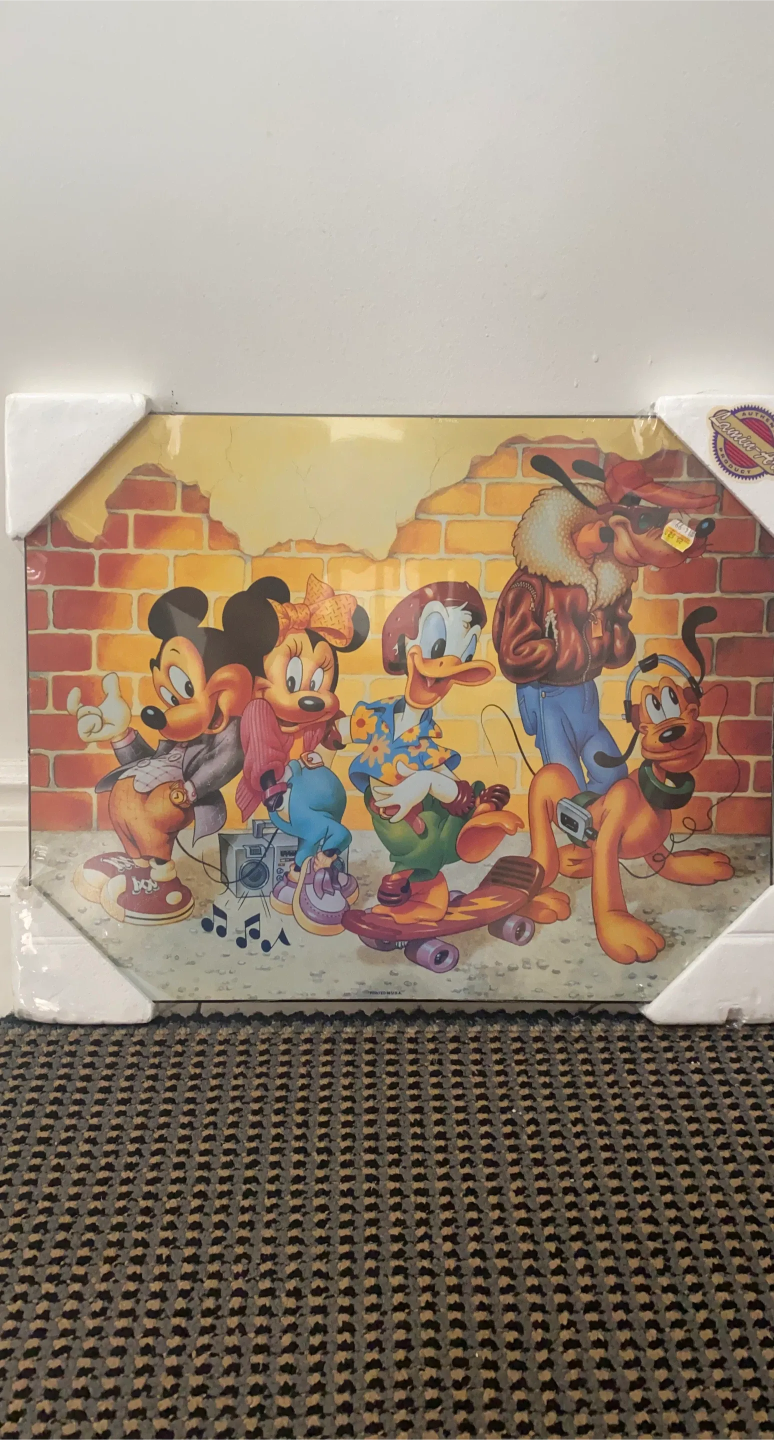 Here's a framed piece of wall art featuring Mickey Mouse, Minnie Mouse, Donald Duck, Goofy, and Pluto! The art shows the characters in a cool, retro style against a brick wall background. It's a fun piece to add some Disney charm to any room