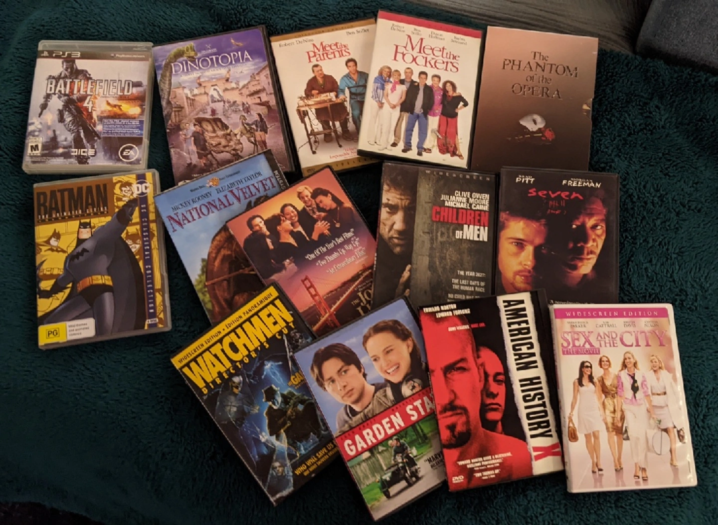 100Selling a collection of DVDs including: - Battlefield 4 (PS3) - Batman - National Velvet - Dinotopia - Meet the Parents - Meet the Fockers - The Phantom of the Opera - Children of Men - Seven - Watchmen Director's Cut - Garden State - American History X - Sex and the City: The Movie