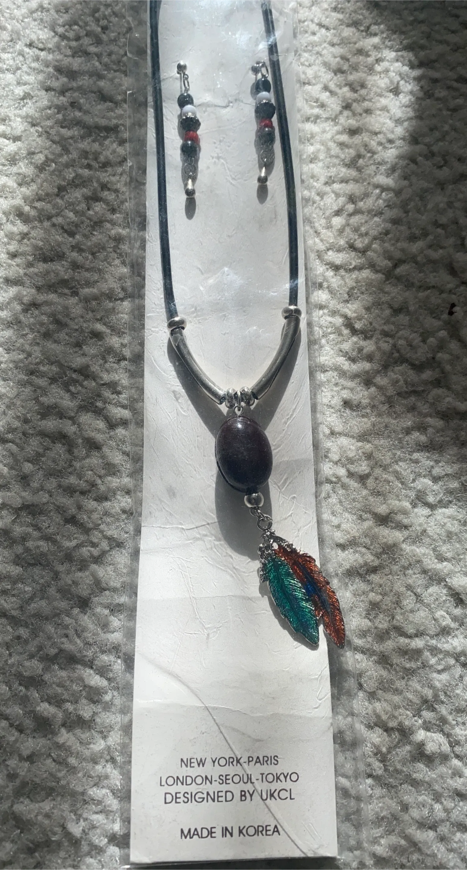 This is a new necklace and earring set designed by UKCL! It's still in its original packaging. The set features a necklace with a dark brown stone pendant and two colourful feathers, along with matching beaded earrings. Made in Korea