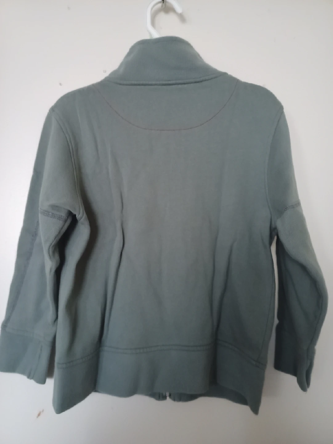 A gently used boys' green zip-up jacket. It's in great condition and perfect for layering during cooler weather. It features a zip-up front and two pockets.