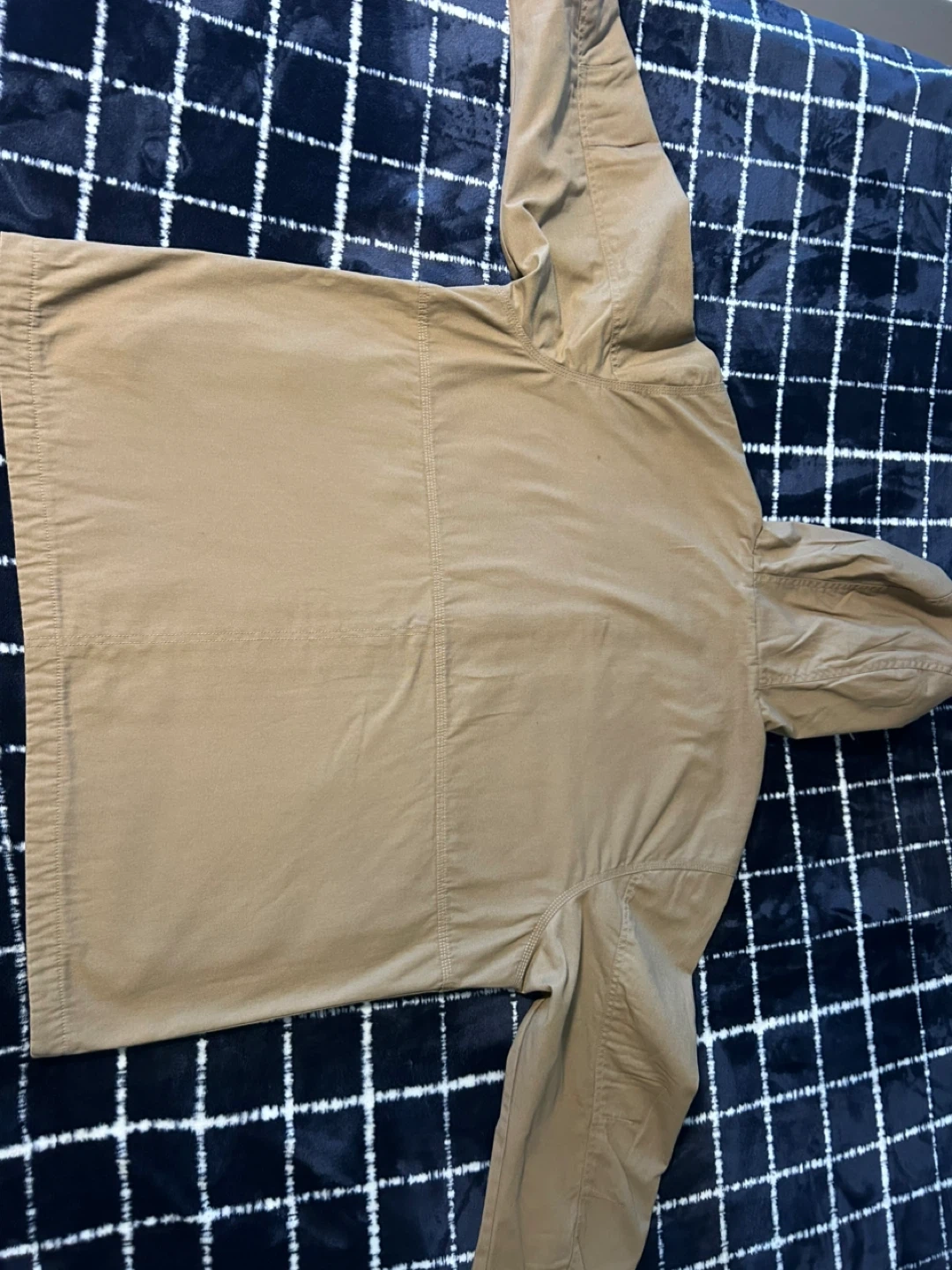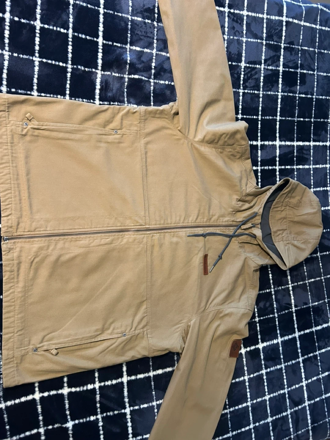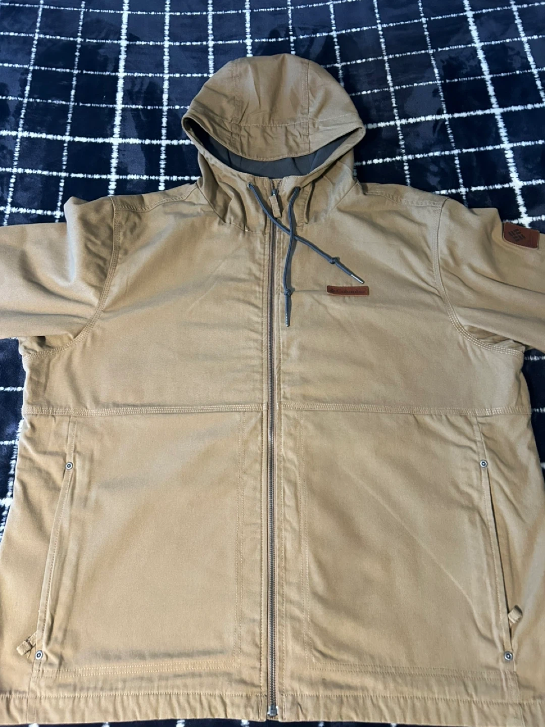71Selling a Columbia hooded jacket for men in size large. It's a tan/khaki colour and in great condition. Perfect for layering or wearing on its own during cooler weather. The jacket features a full zip closure, a hood, and several pockets for storage. Great for everyday wear!