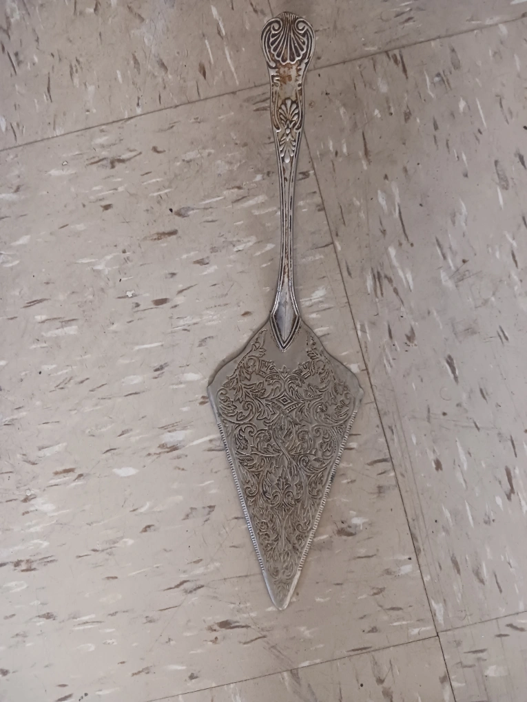 Selling a vintage silver cake server. It has a beautiful, ornate design and would be a lovely addition to any table setting. It's in good condition and ready for a new home!