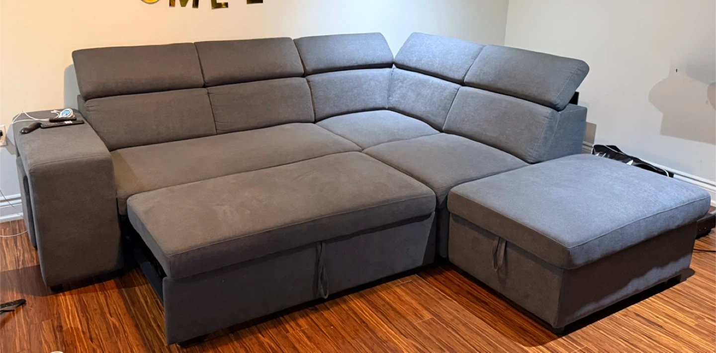 Selling our gently used traditional sectional sofa-bed with built-in storage. It was placed in our basement, which we rarely used so it’s still in excellent condition.