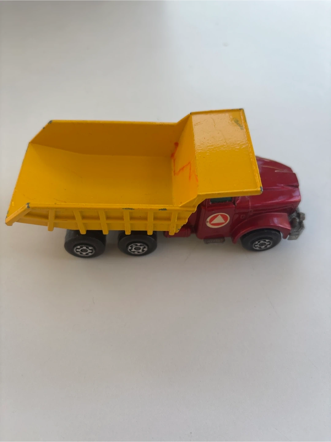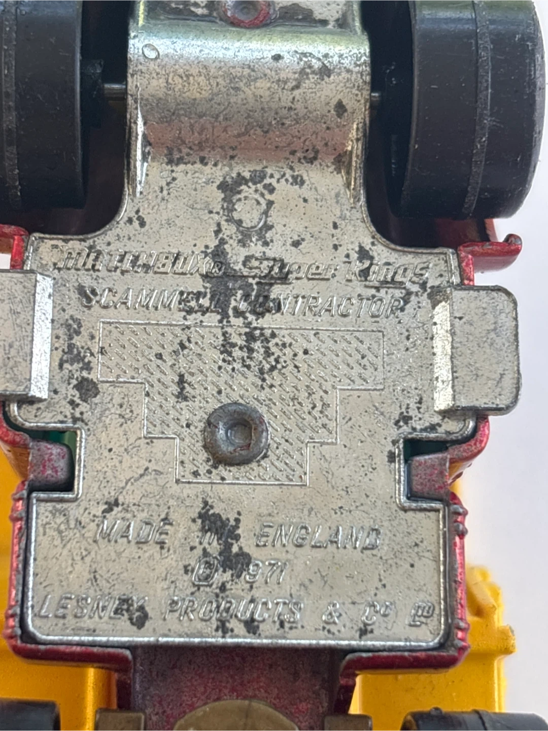 Selling a vintage Matchbox Super Kings Scammell Contractor toy truck! Made in England in 1971, this Lesney Products & Co toy has a yellow dump bed and red cab. It shows some signs of wear due to its age, but it's still a cool piece for any collector