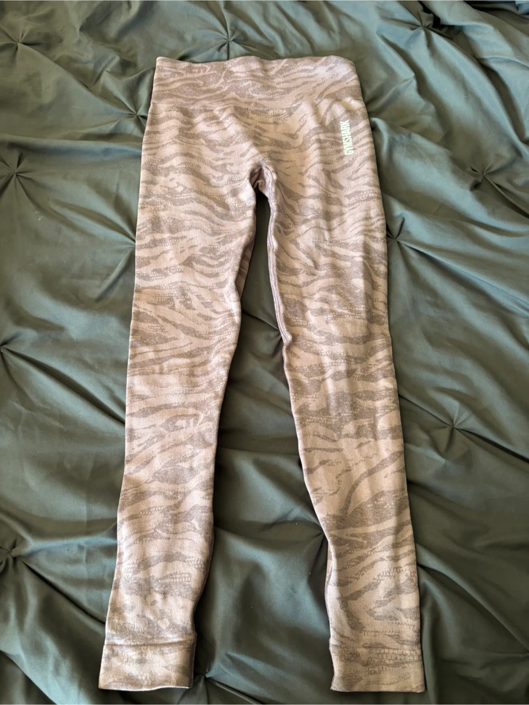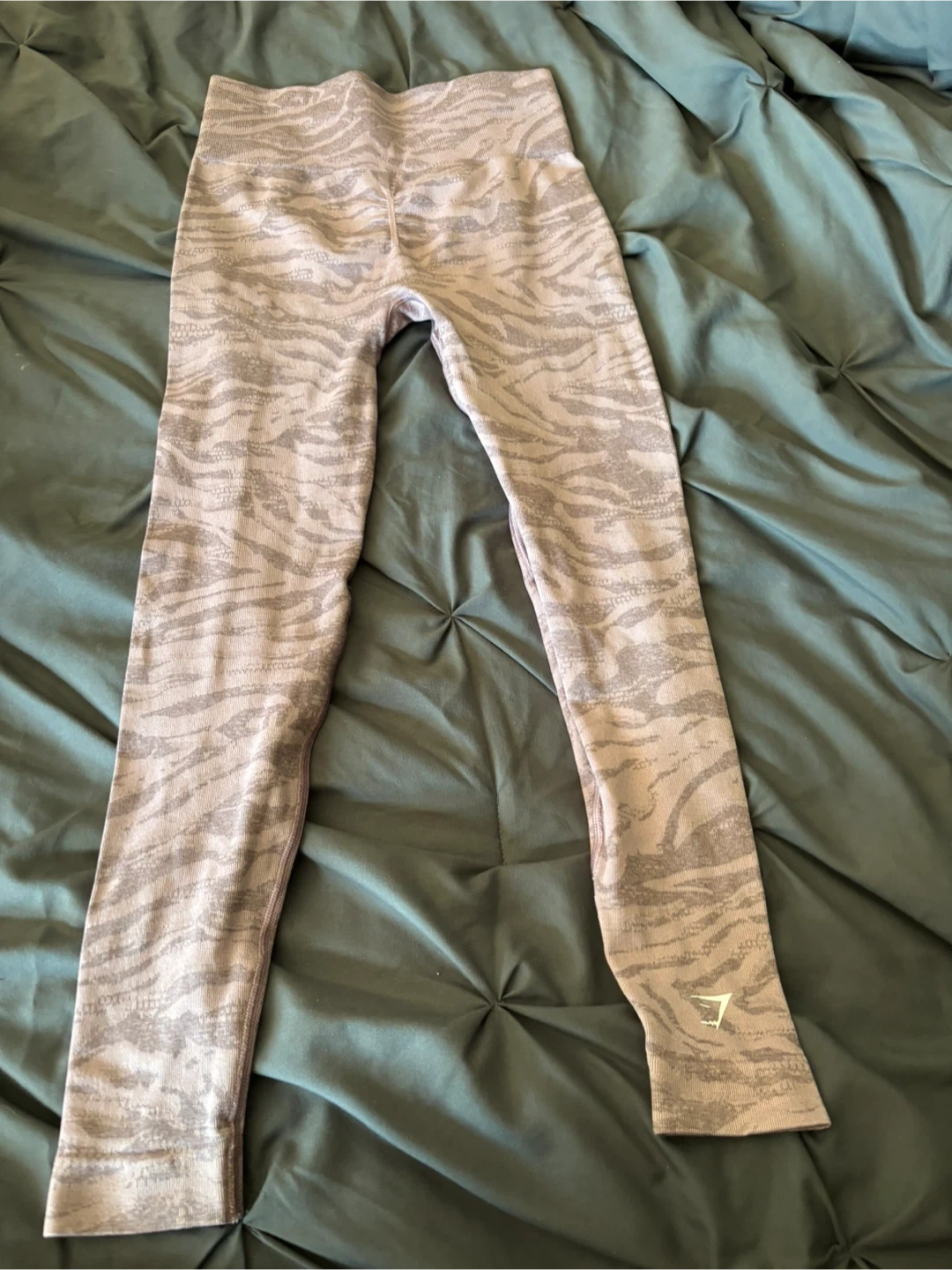 115Selling a pair of Gymshark Animal Seamless leggings in a size small. They have a unique animal print and are in great condition. The inseam measures approximately 22 inches, and the waistband is about 11 inches across. Perfect for your next workout! Tag removes fits xs. See pics