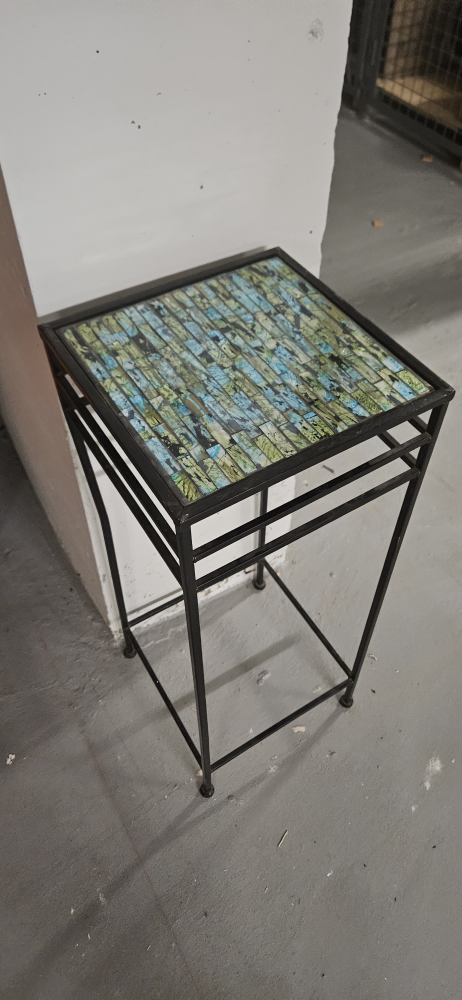 This is a cute little side table with a mosaic tile top. It has a black metal frame. It's perfect for small spaces or as an accent piece
