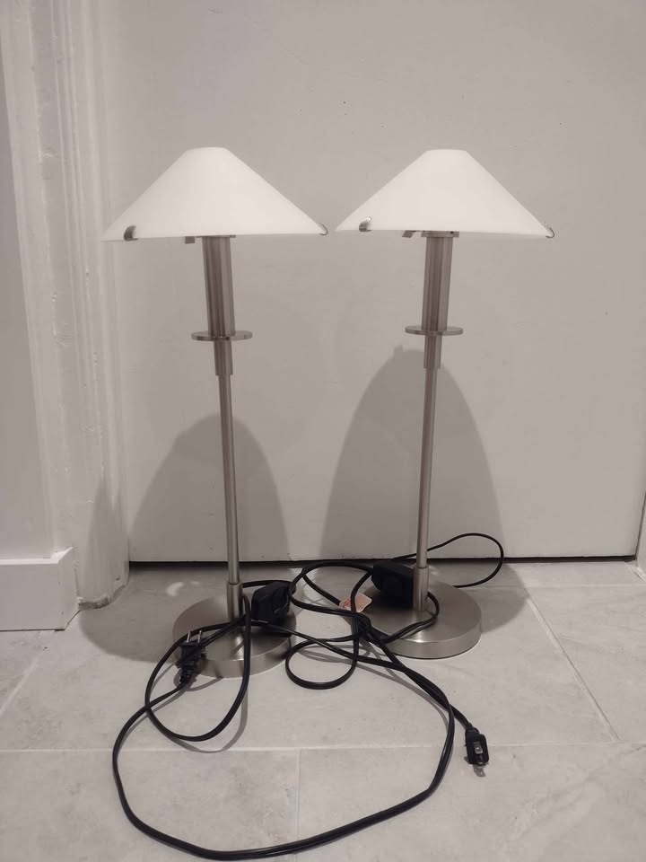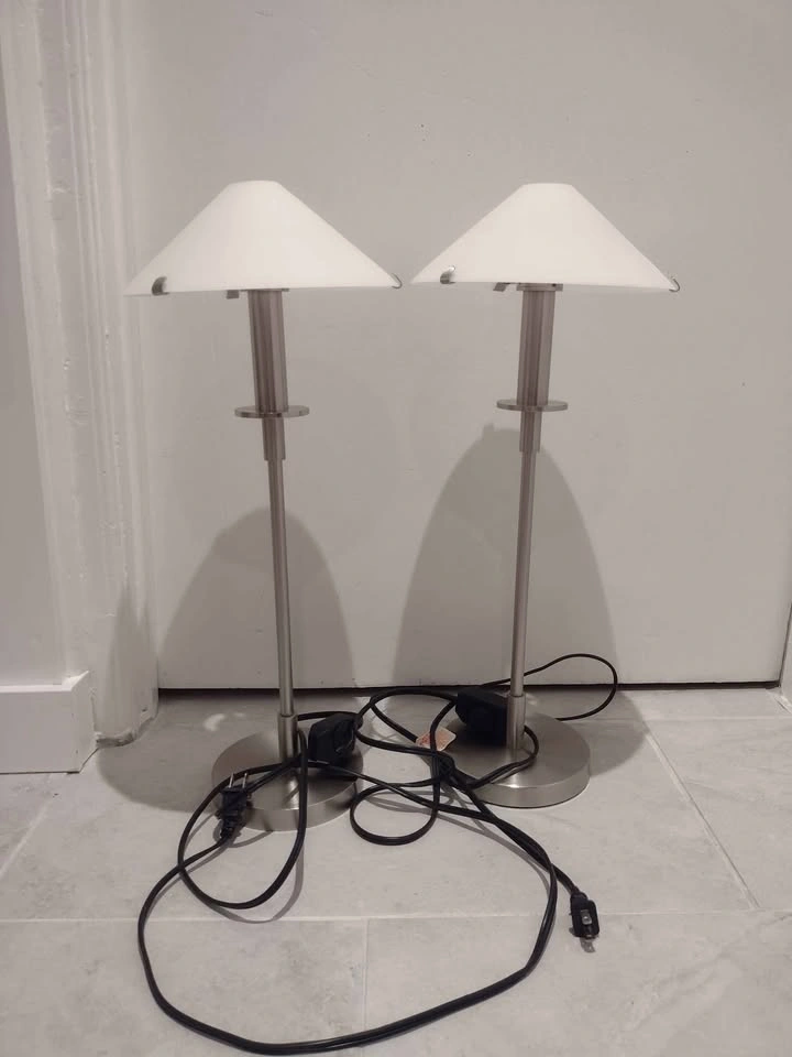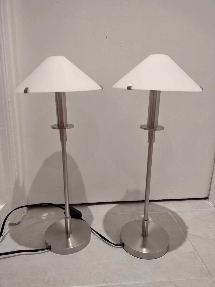 These are the best table lamps I have ever owned but unfortunately they do not suit my new bedroom. Selling as a set of two, open to offers and trades. Pickup by Donlands station.