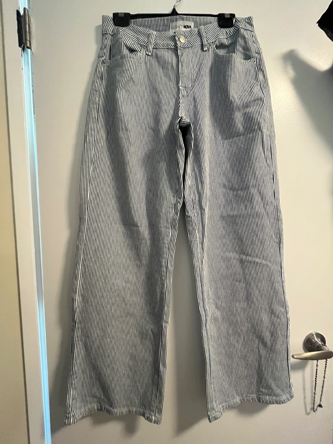 Selling a pair of Fashion Nova striped , high waisted,wide leg, tall pants in size 9. They are made of 99.5% rayon and 0.5% spandex. The style number is D5953495MED.