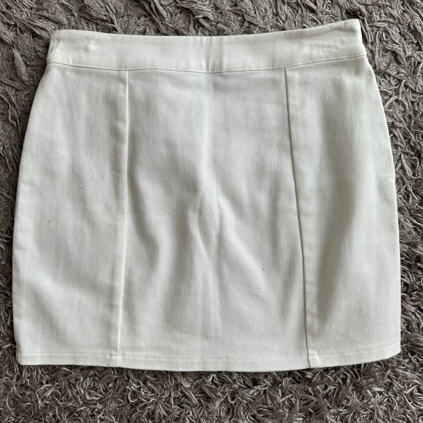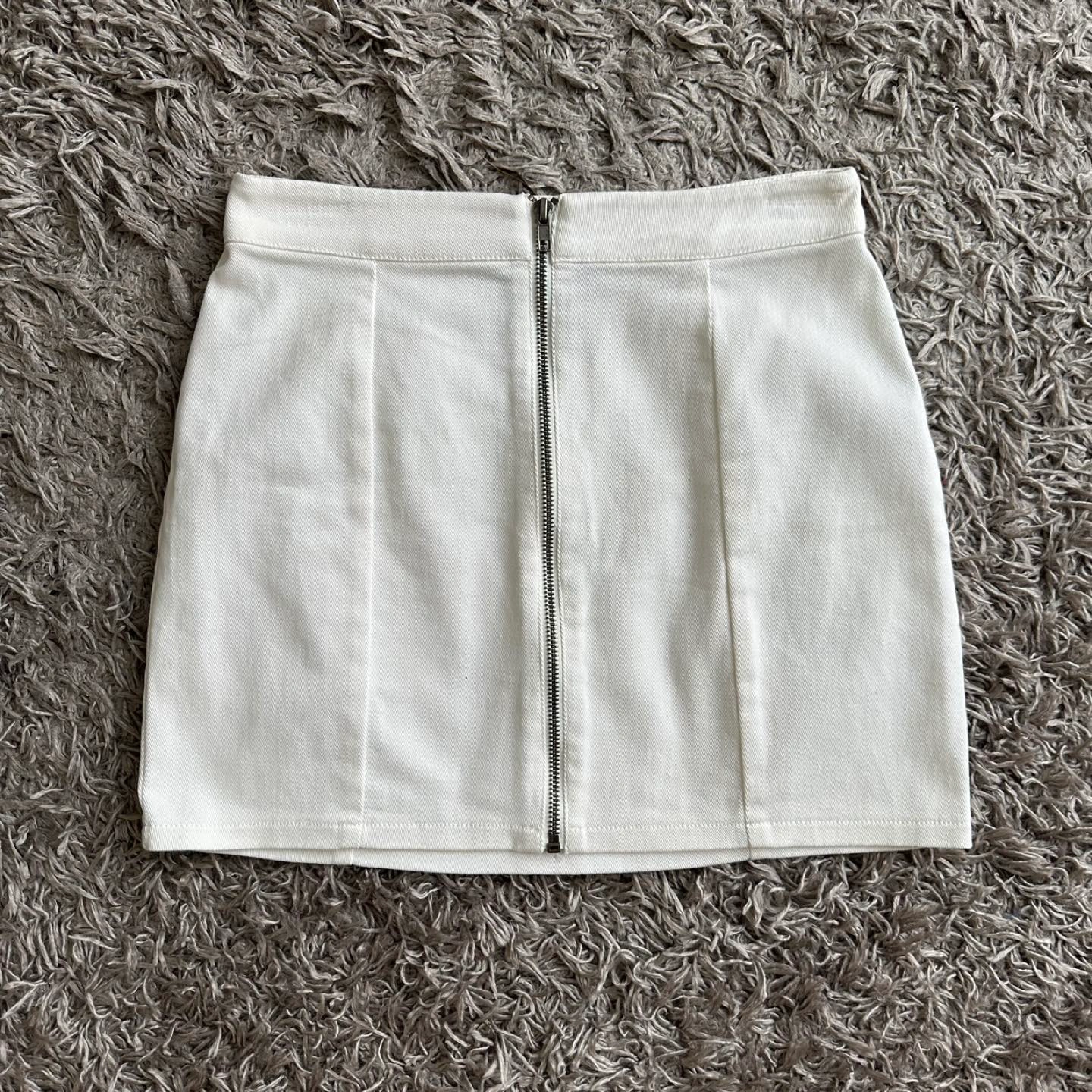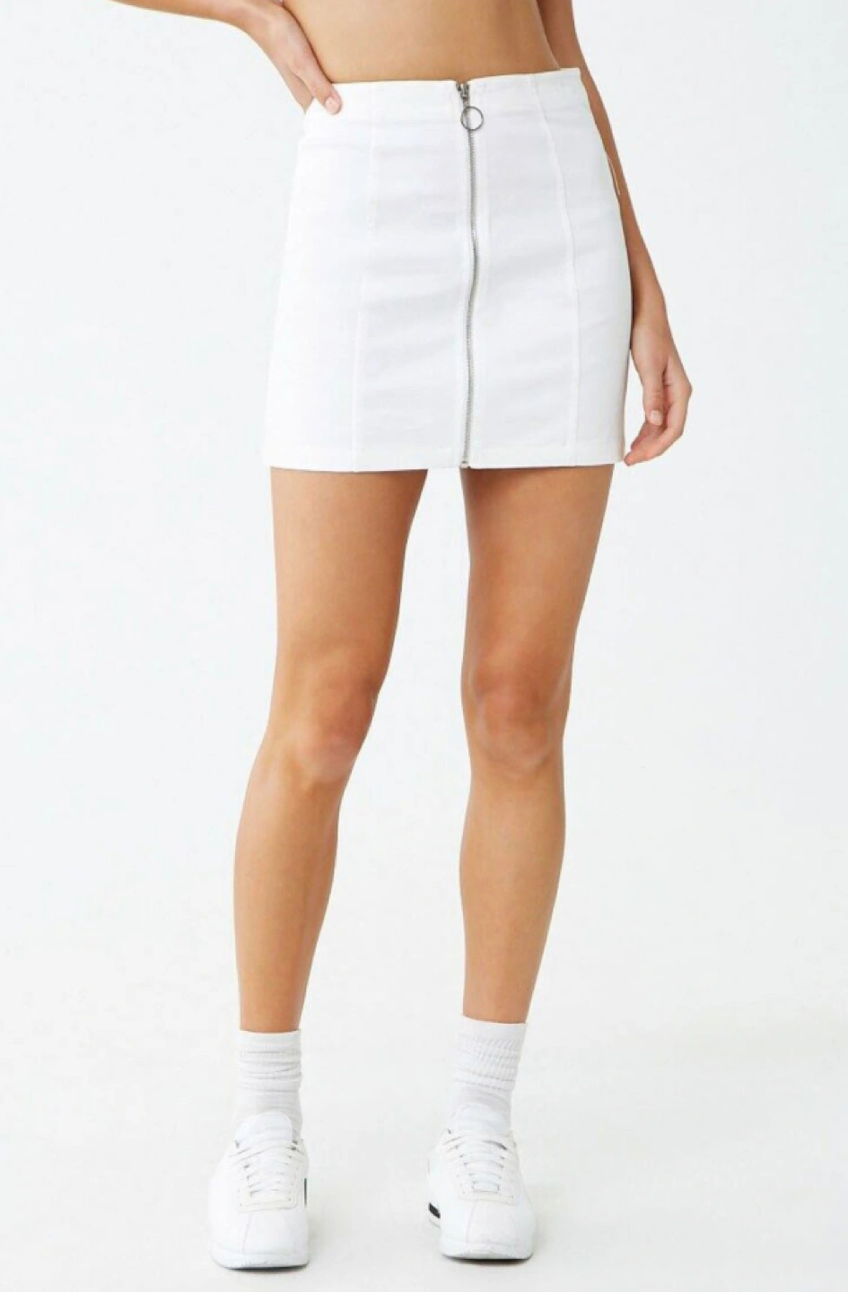 Brand new, never been worn (without tags) white zip-front denim skirt from Forever 21. Size small. Mini skirt featuring a zippered front, seam construction and an A-line silhouette.