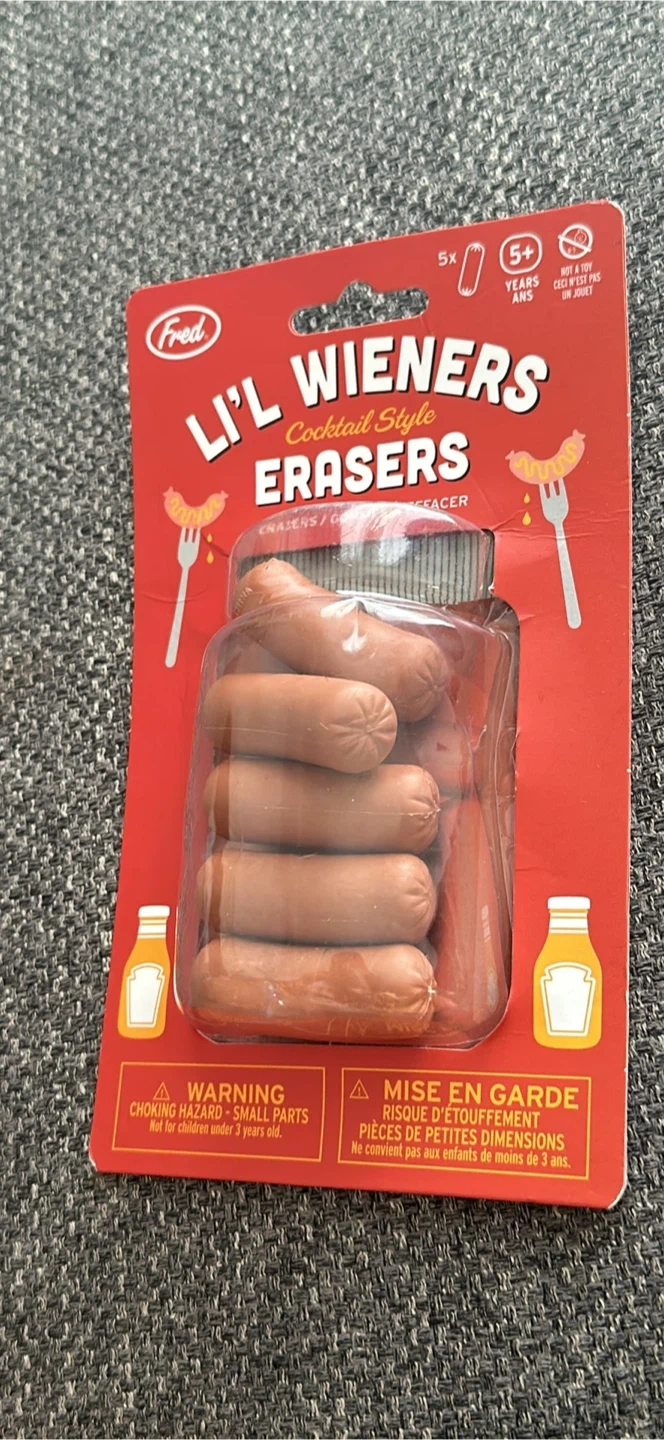 Brand new Fred Li'l Wieners Cocktail Style Erasers! These fun erasers are shaped like miniature sausages and come in a cute jar-like container. Perfect for adding a touch of whimsy to your desk or as a fun gift for someone with a sense of humour