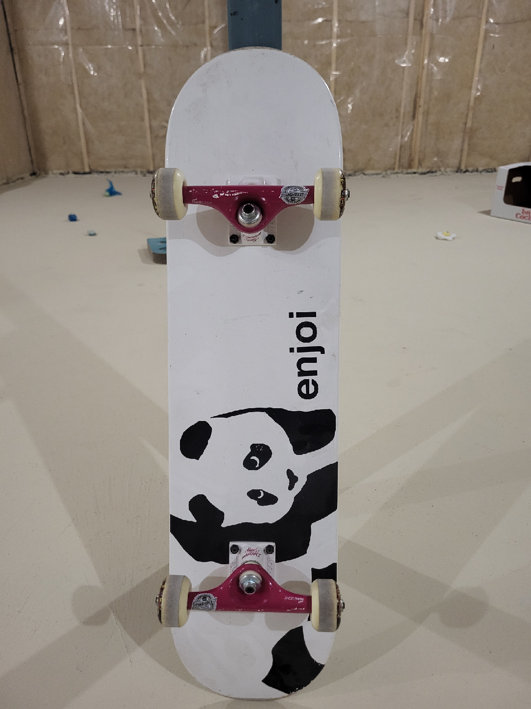 Selling an Enjoi skateboard featuring a cool panda design! It's in good condition and ready to ride. The trucks are magenta. Perfect for anyone looking to cruise around town or hit the skate park