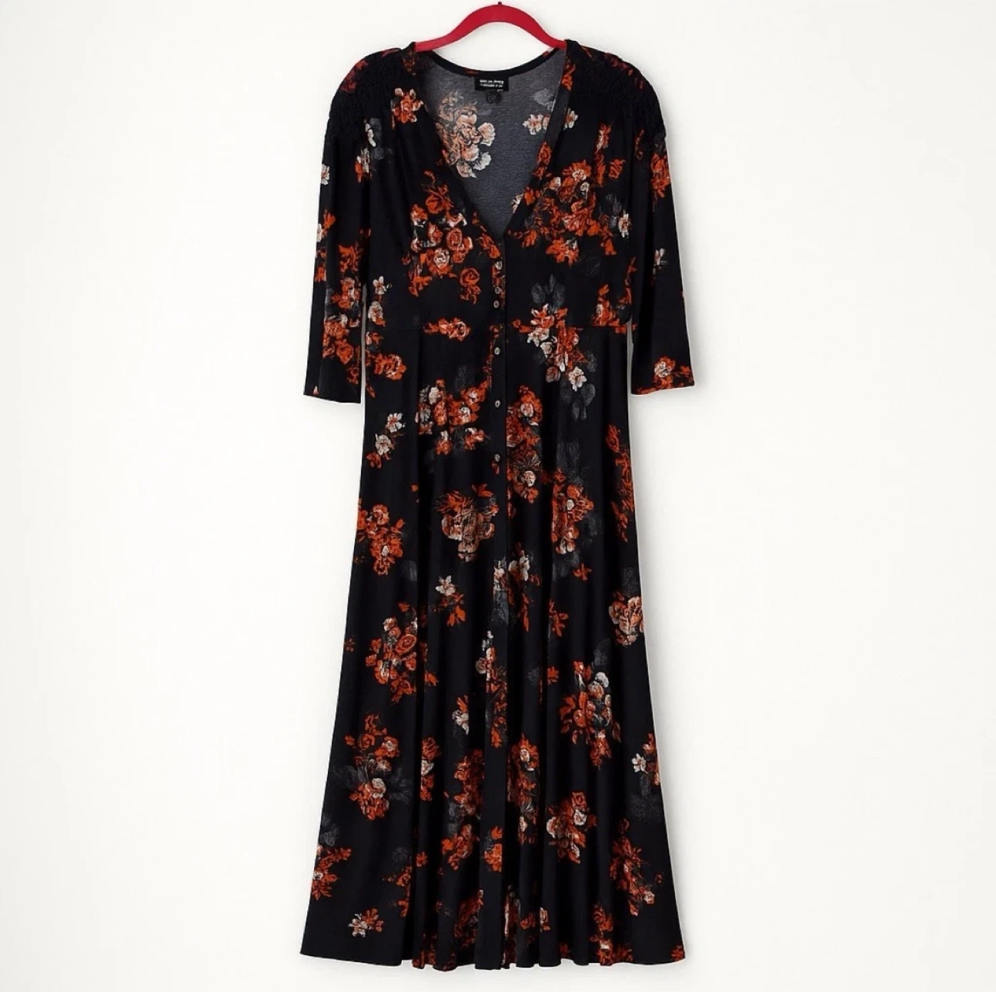 It's a size 2 and features delicate lace detailing on the shoulders, matching buttons that go all the way down and multiple slits in the front of the dress. 3/4 sleeves. The dress is new without tags and ready to grace your wardrobe!