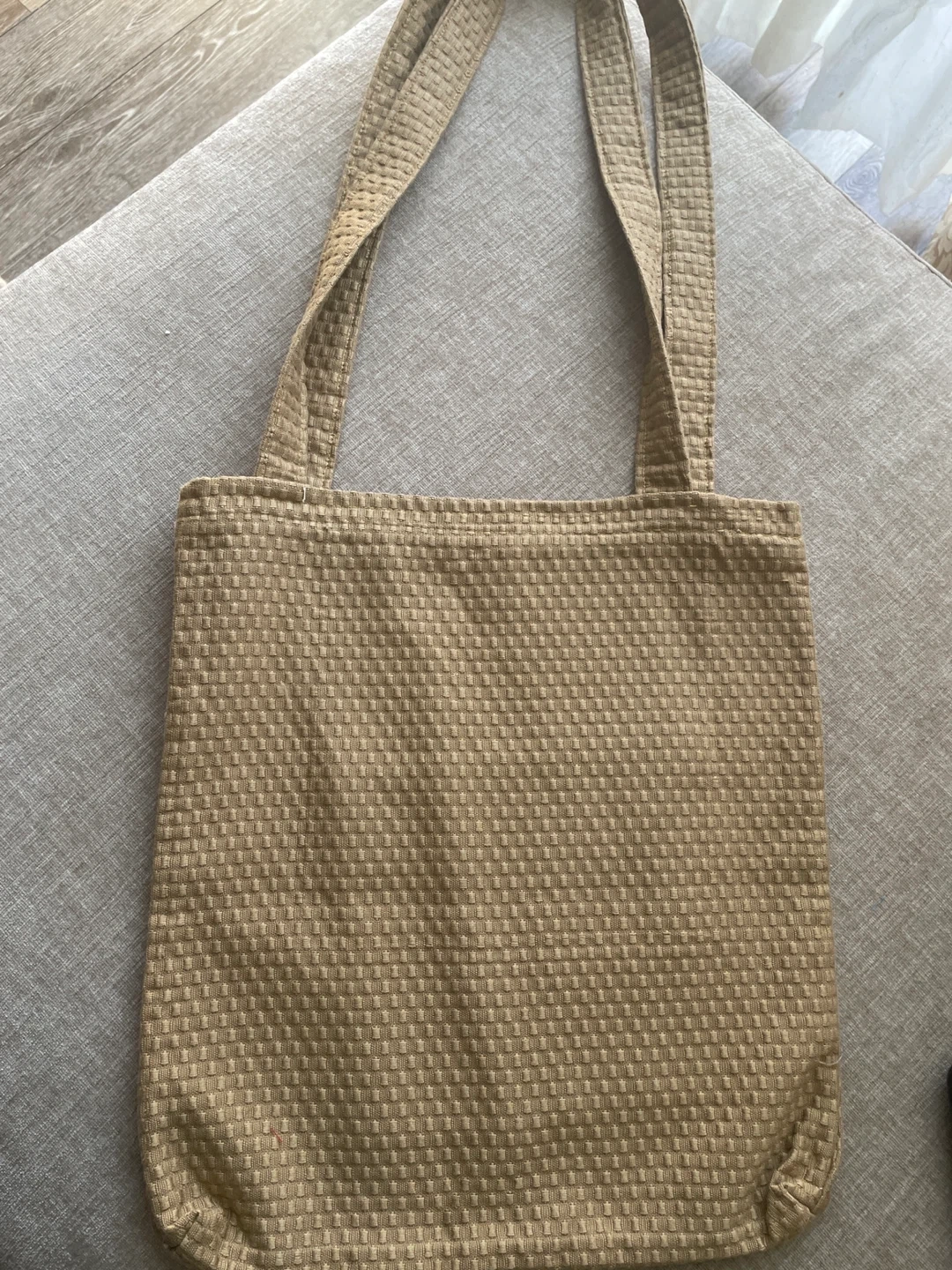 Selling a beige tote bag with a waffle weave texture. It's a simple and stylish bag perfect for everyday use. The material is soft and durable, making it great for carrying your essentials. It's in good condition and ready for a new home!