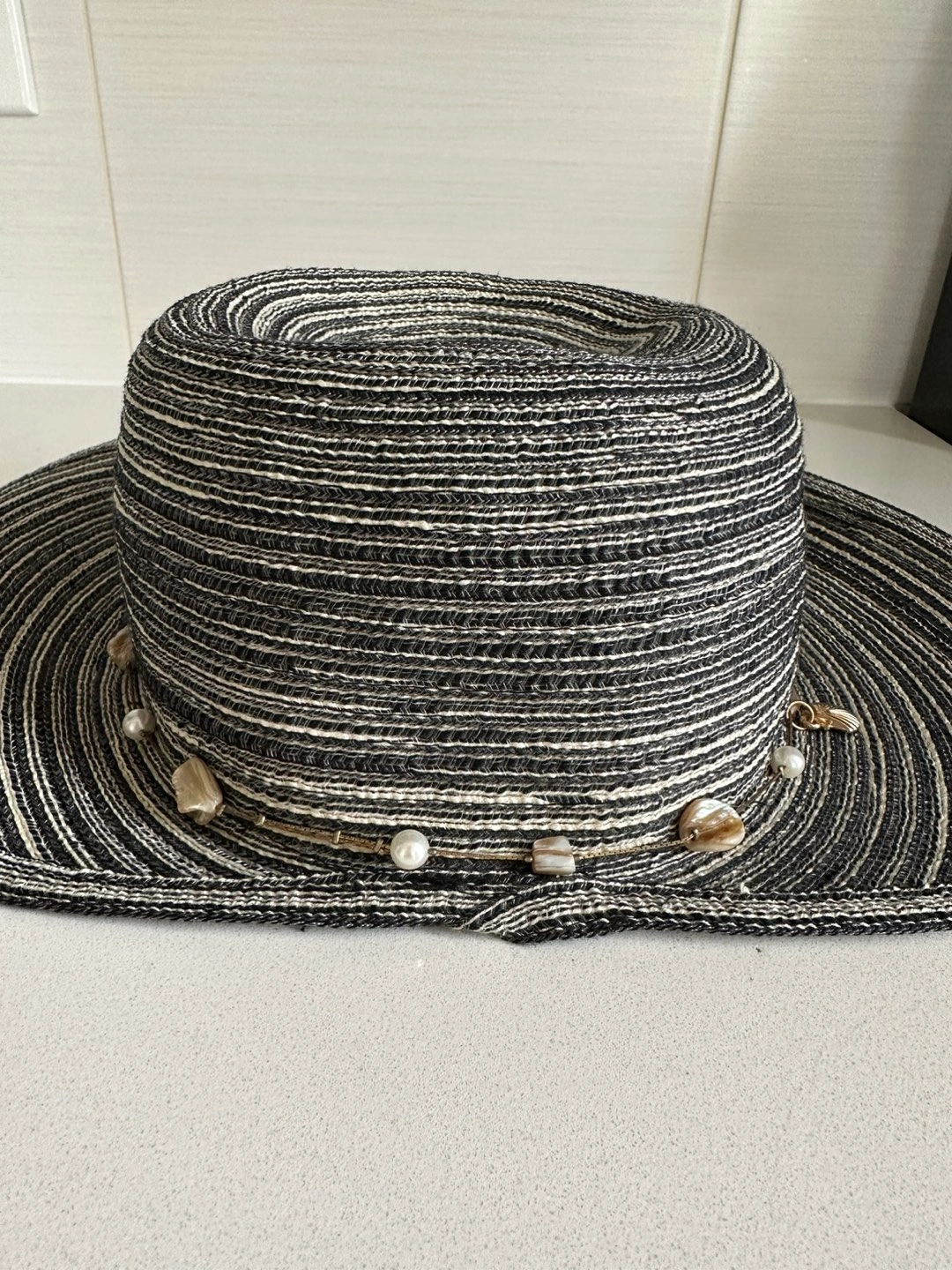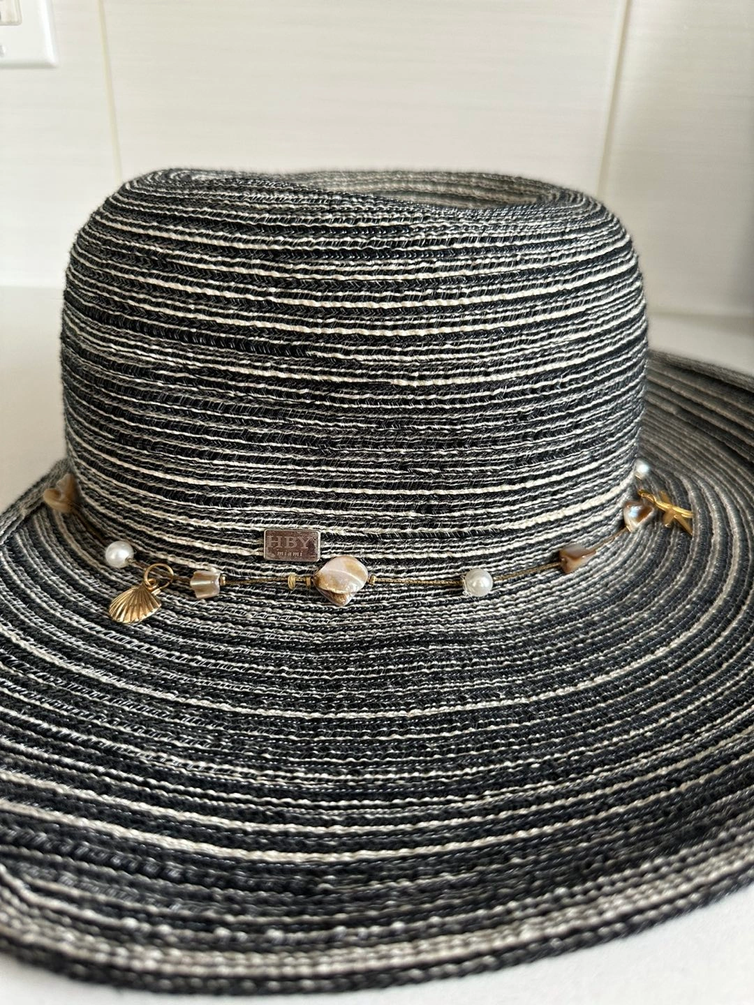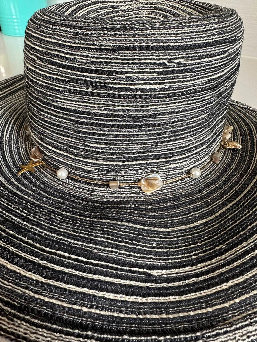 Like new, has been sitting in the closet grey and white sun hat with shell charms on the trim from HBY Miami. One size fits most (inner size adjustable strings). Spot clean.