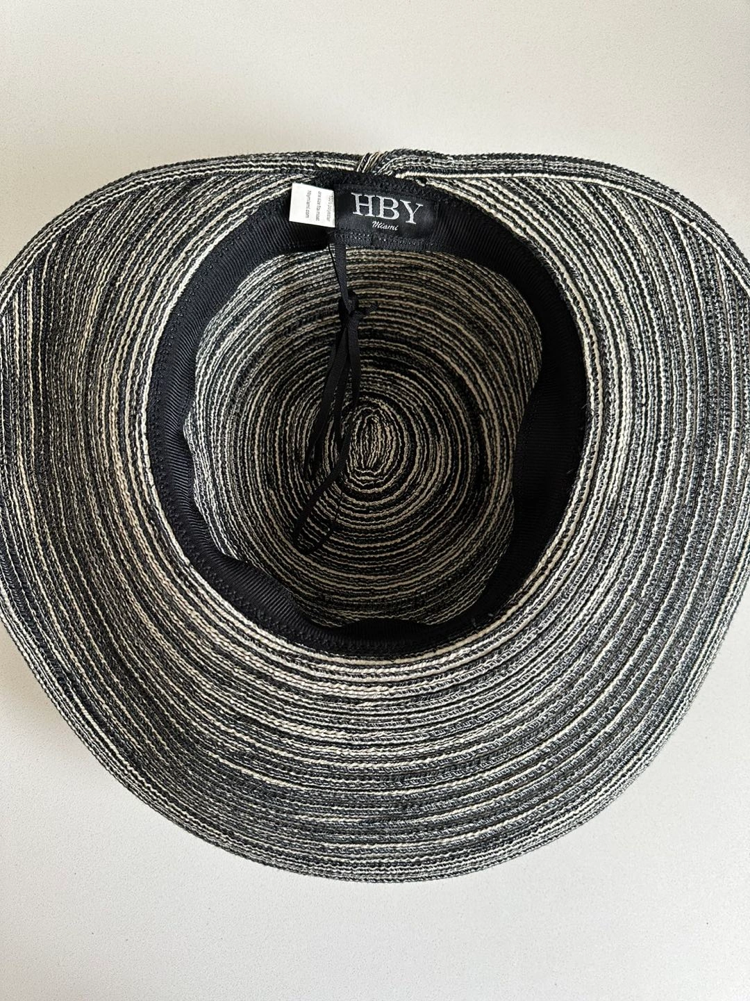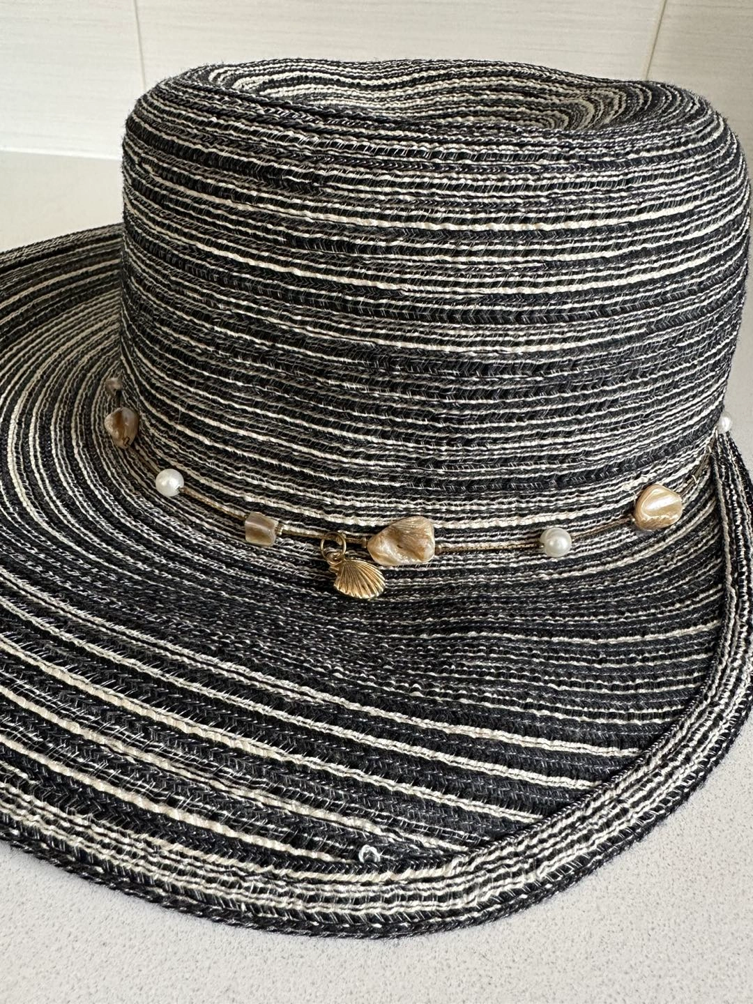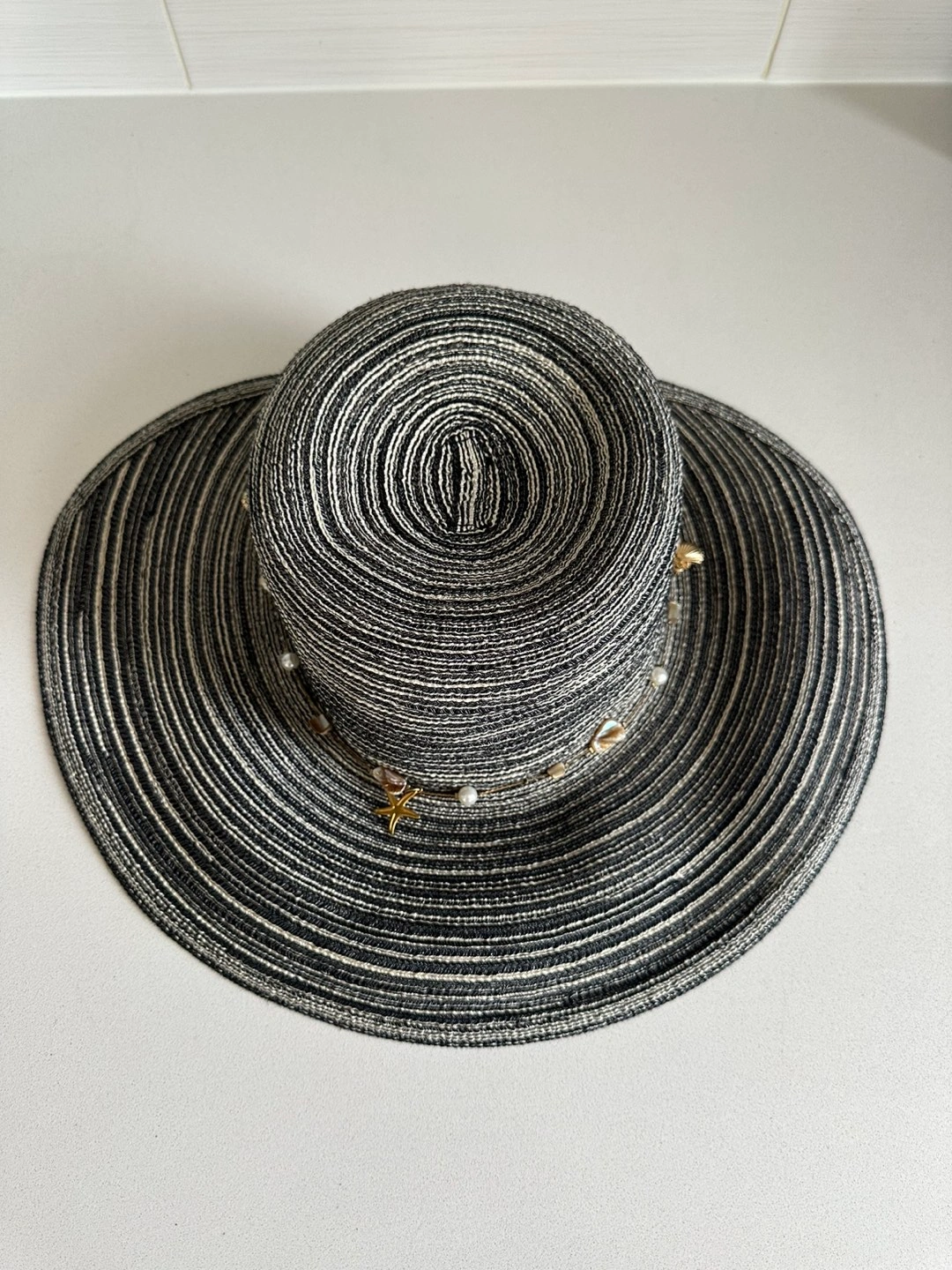 Like new, has been sitting in the closet grey and white sun hat with shell charms on the trim from HBY Miami. One size fits most (inner size adjustable strings). Spot clean.