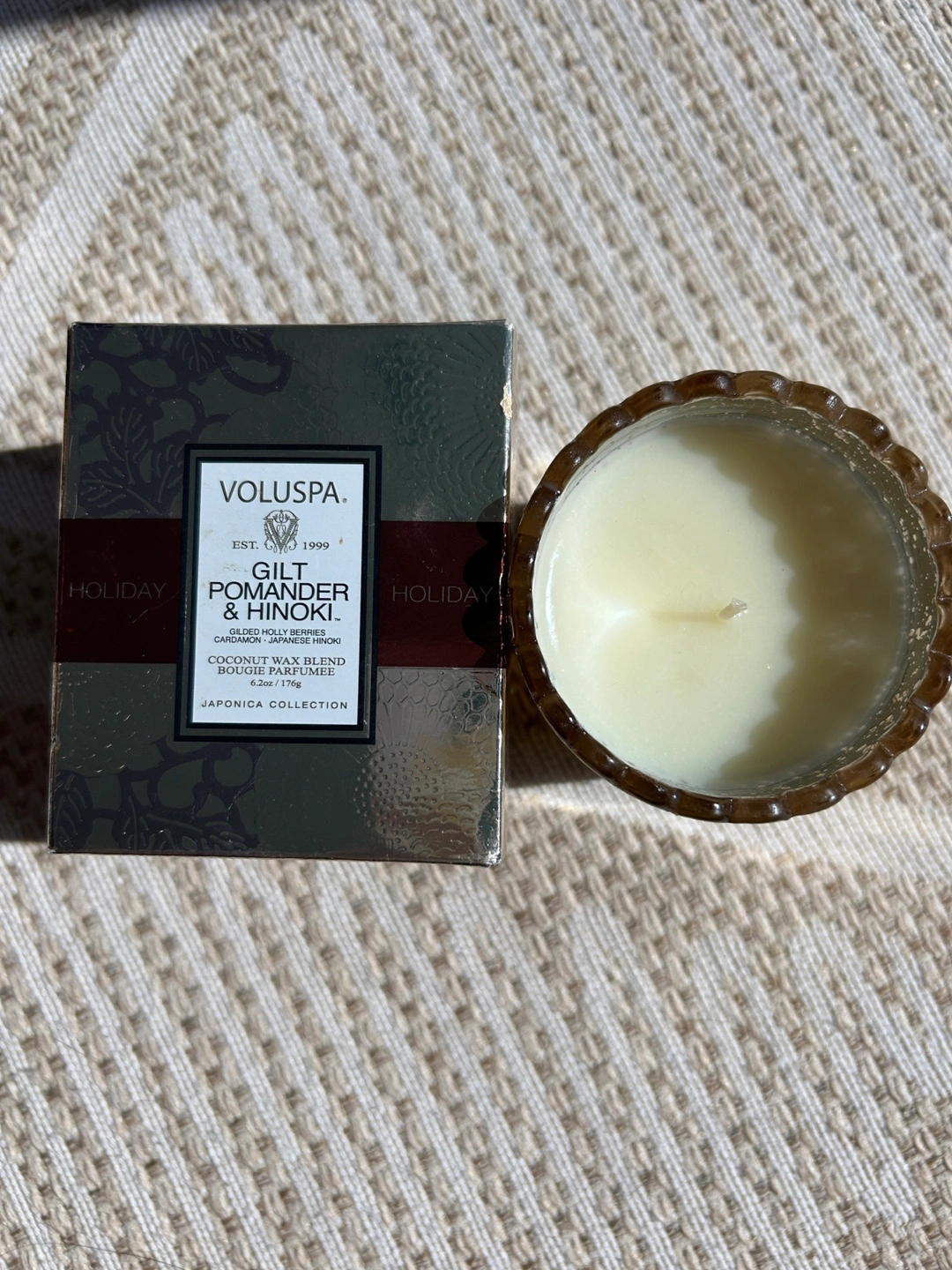 Selling a Brand New! never used Voluspa Gilt Pomander & Hinoki glass candle from the holiday Collection!