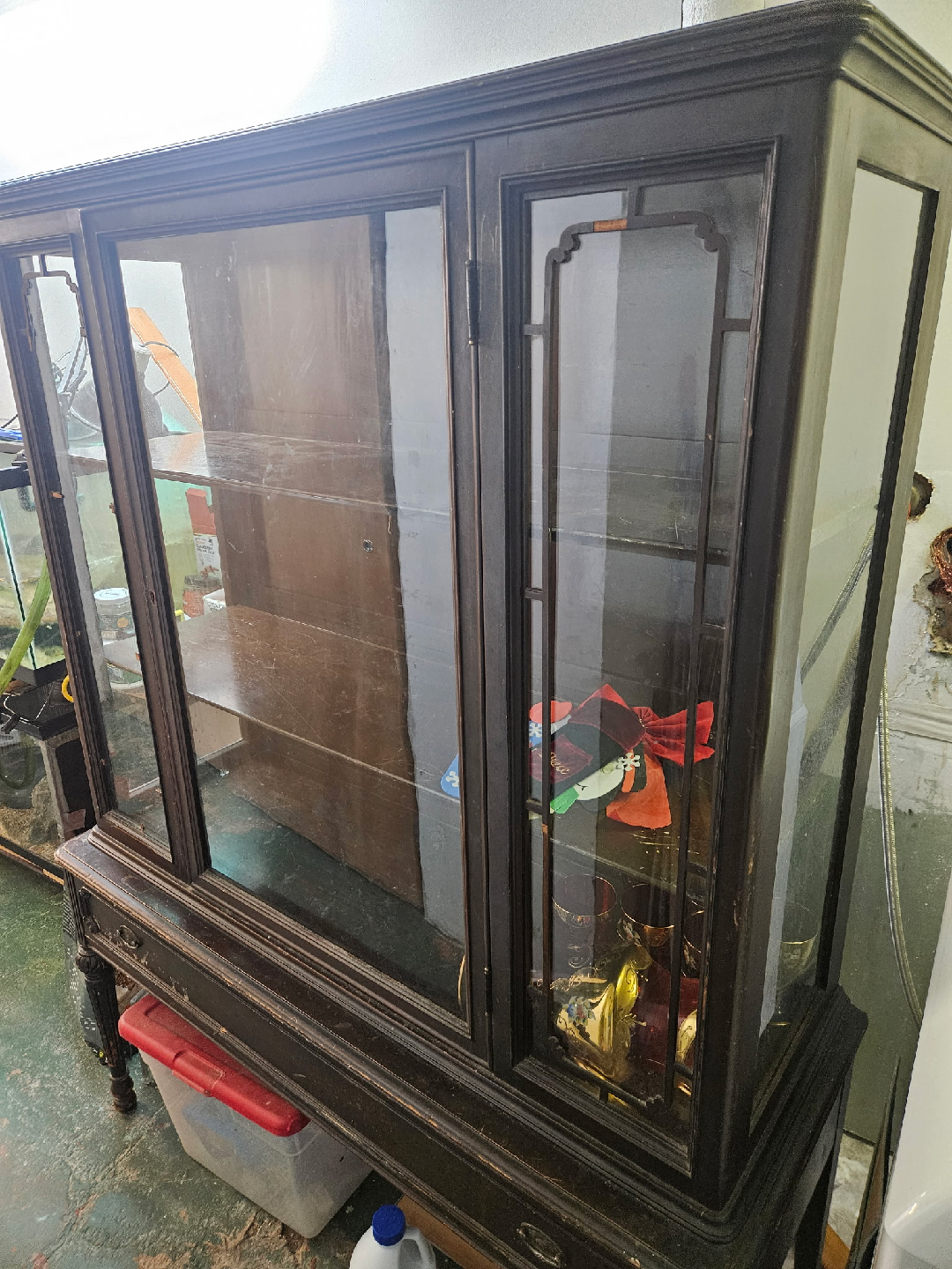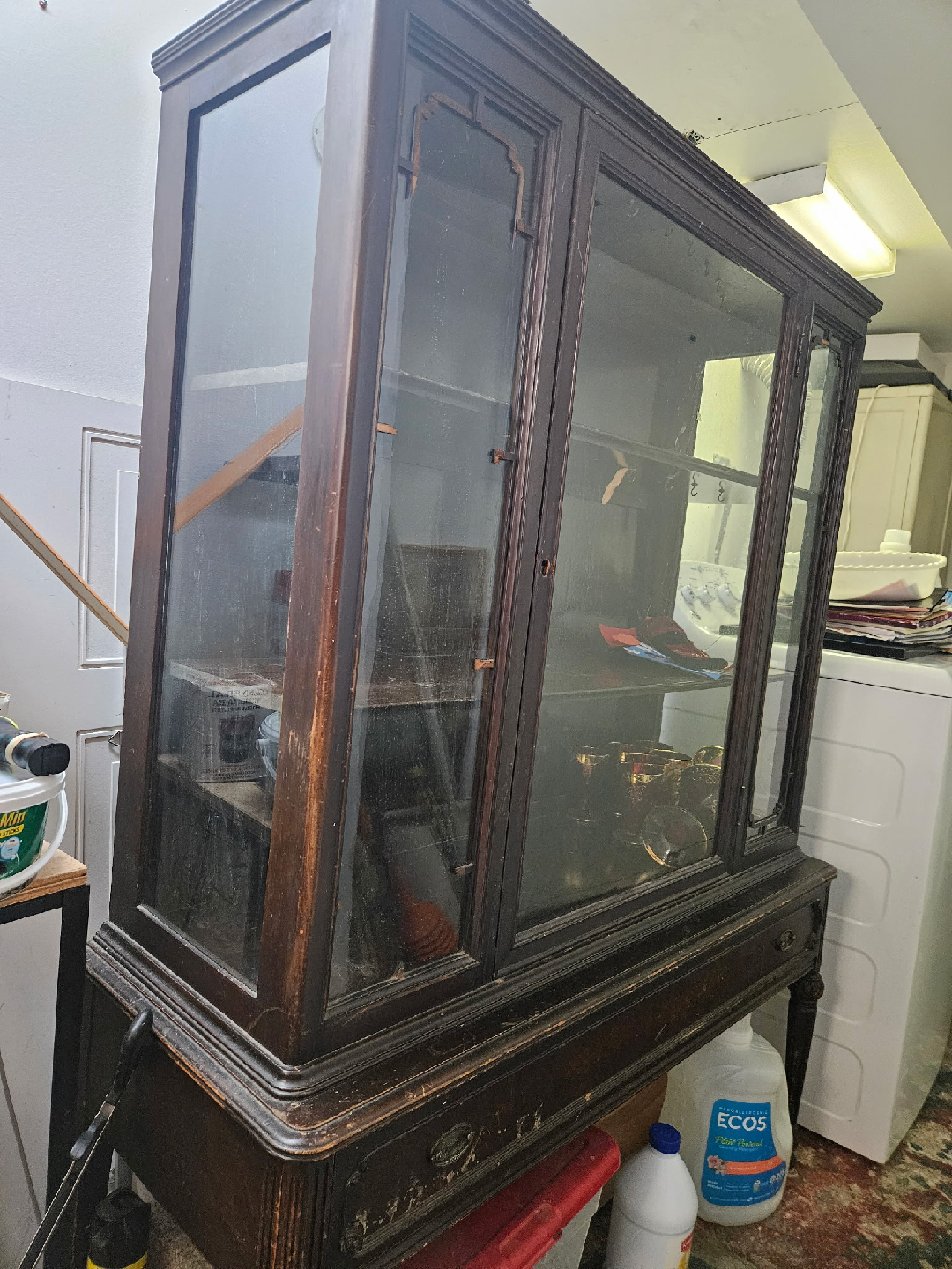 Antique sturdy solid wood display cabinet from the mid to late 1800s. Has glass doors and wooden shelves, perfect for displaying china or collectible pieces. Has 1 drawer where you can store place mats, tablecloths or other items. Needs TLC. It once belonged to my husband's great grandmother. Approx size 42x61x17 PU Astoria Park south and 21st