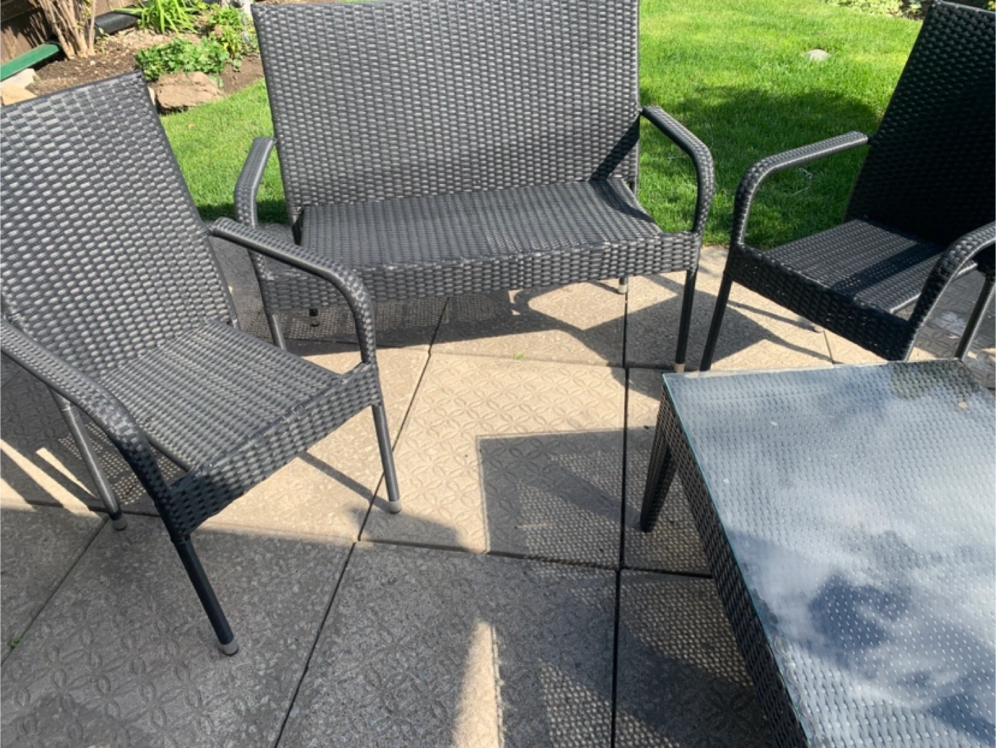 Selling a lovely wicker patio set! It includes two chairs, a loveseat, and a table with a glass top. Perfect for enjoying the outdoors in comfort and style!