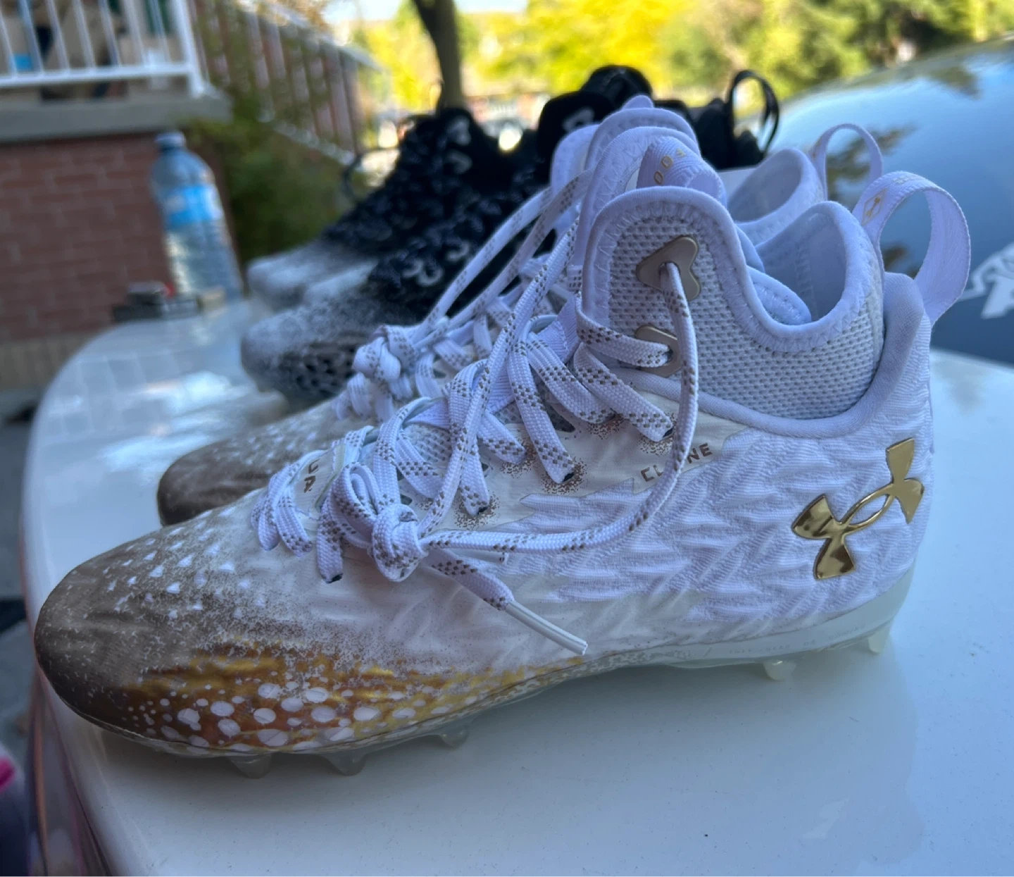 Selling a pair of Under Armour Clone football cleats. They have a unique textured design and the Under Armour logo. Perfect for the upcoming football season! Black pair x2 size10 & size 6 White gold pair size 6.5