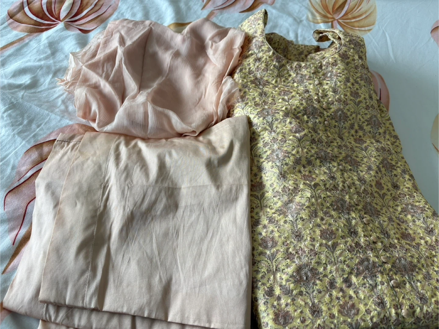 Selling a beautiful Salwar Kameez suit set! It includes a yellow patterned kameez (top), pink salwar (bottoms), and a matching pink dupatta (scarf). Perfect for special occasions or everyday wear