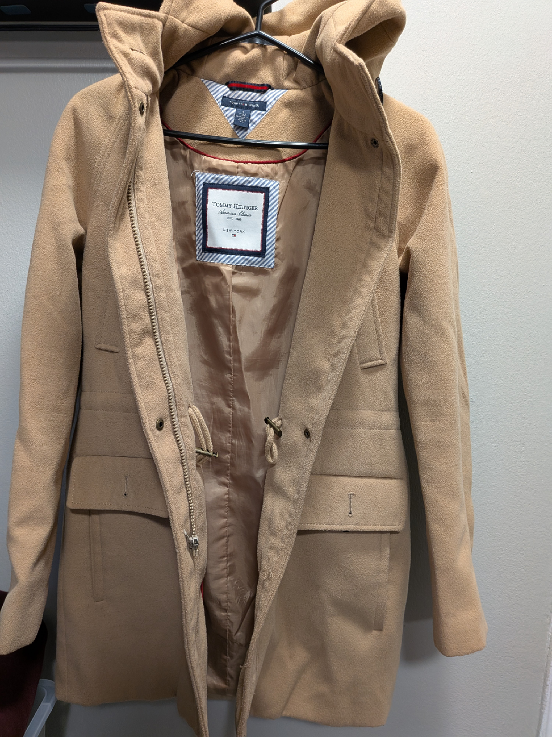 Selling a Tommy Hilfiger coat in a lovely beige colour! It's in great condition and features a hood, perfect for those cooler days. The size isn't indicated on the tag, but it fits like a women's small or medium. A classic piece to add to your wardrobe!