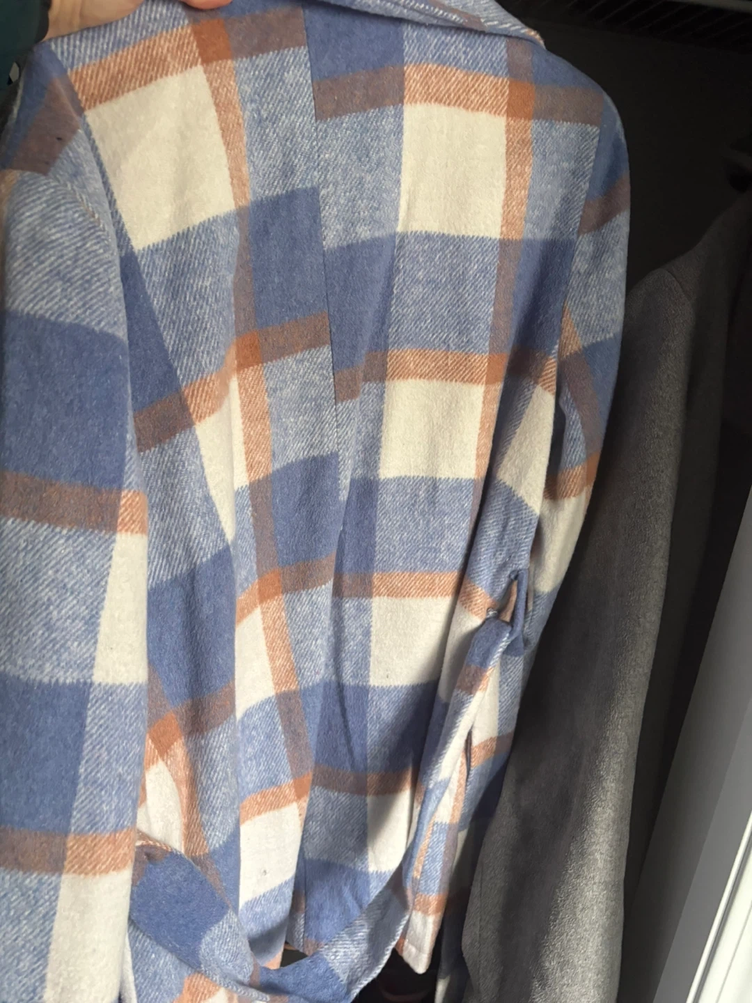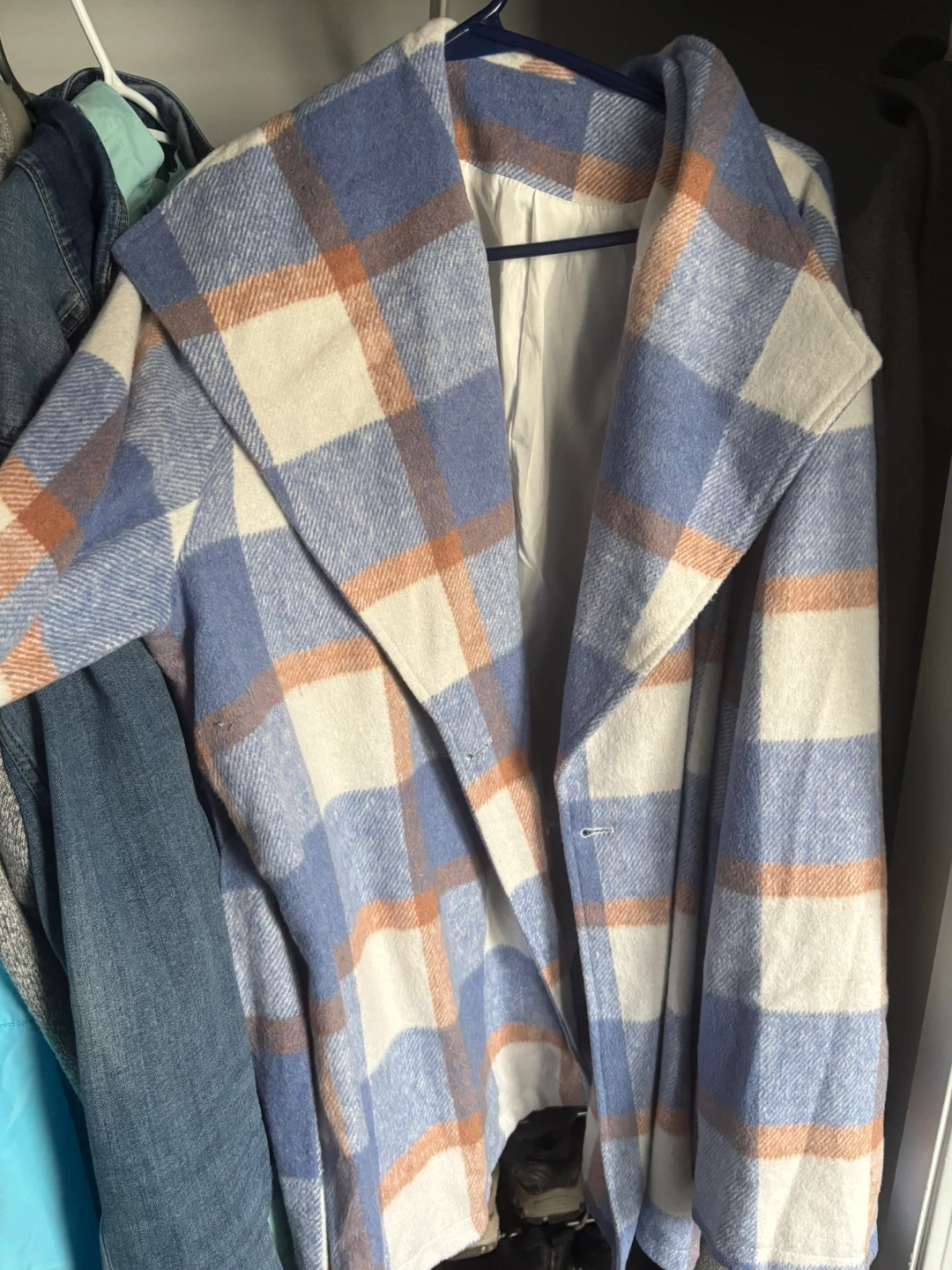 Cozy plaid coat in a wool blend! It's in great shape and ready to keep you warm. The colours are a lovely mix of blue, white, and a touch of orange in the plaid pattern